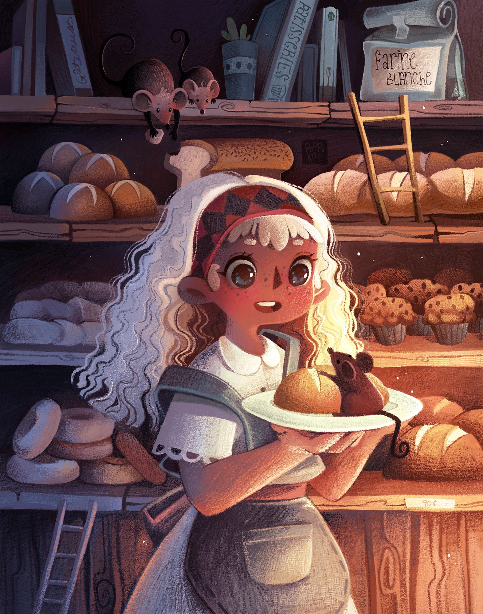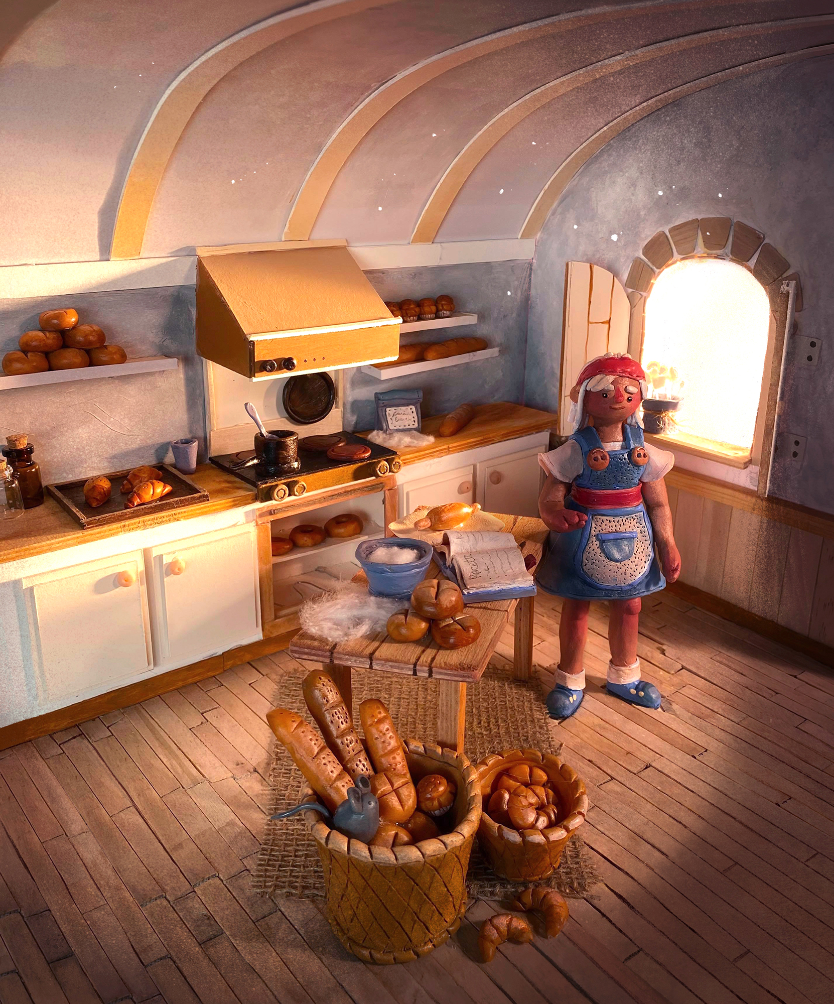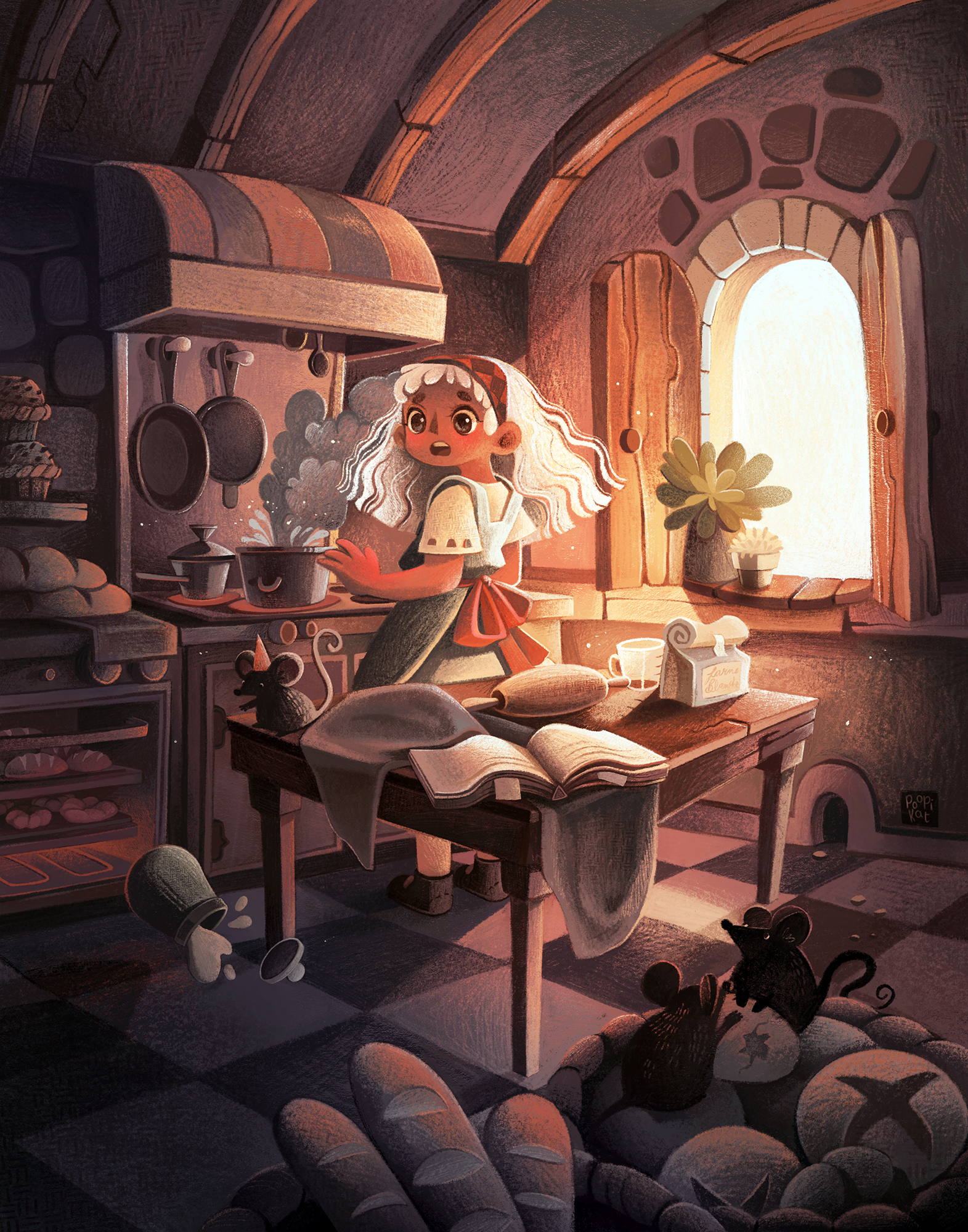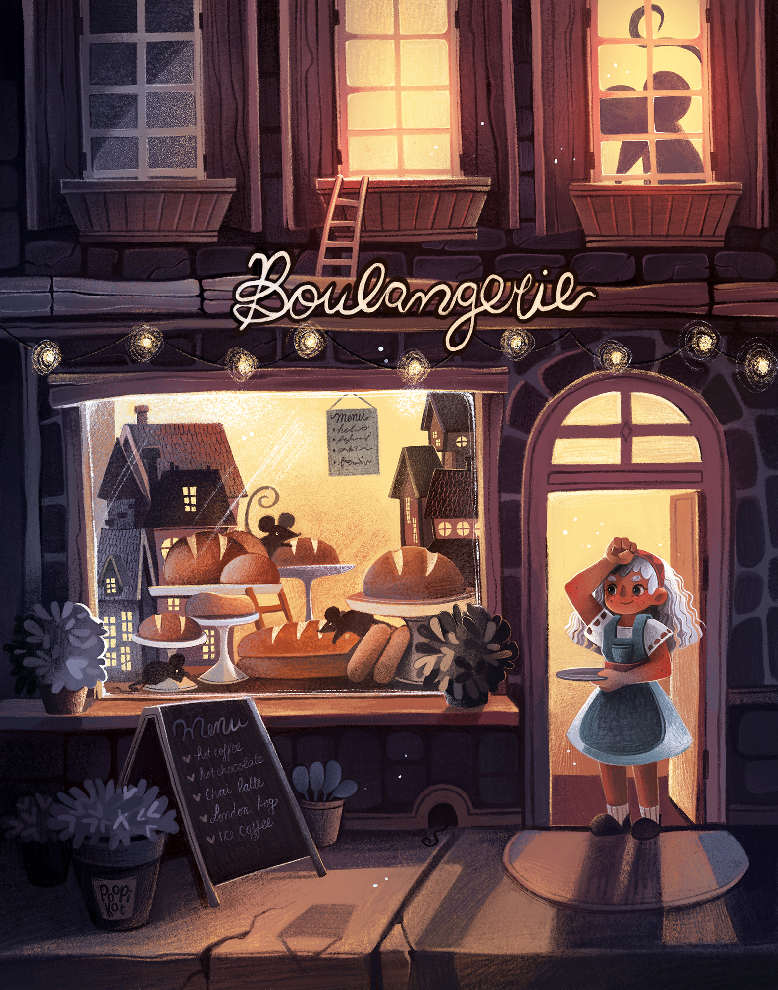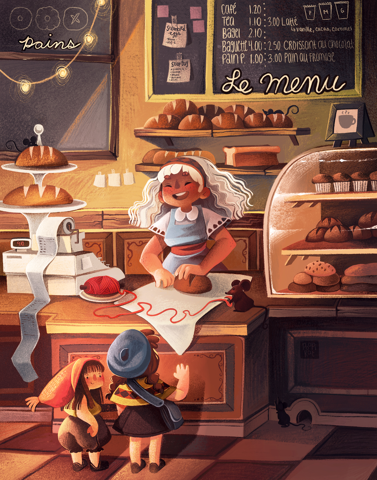 The old architecture and landscapes found in northern England were the initial inspiration for both my series “Can You Find Them All?” and for my new picture book Tilly & the Woods. Each piece in the series portrays a different dilemma and secret within the bakery and touches on the theme of “mutual aid”. I’ve done this to pique curiosity in the child viewer through a search-and-find experience. To find all the hidden mice and deeper messages, the viewer may need to look closely at the images and miniature kitchen.