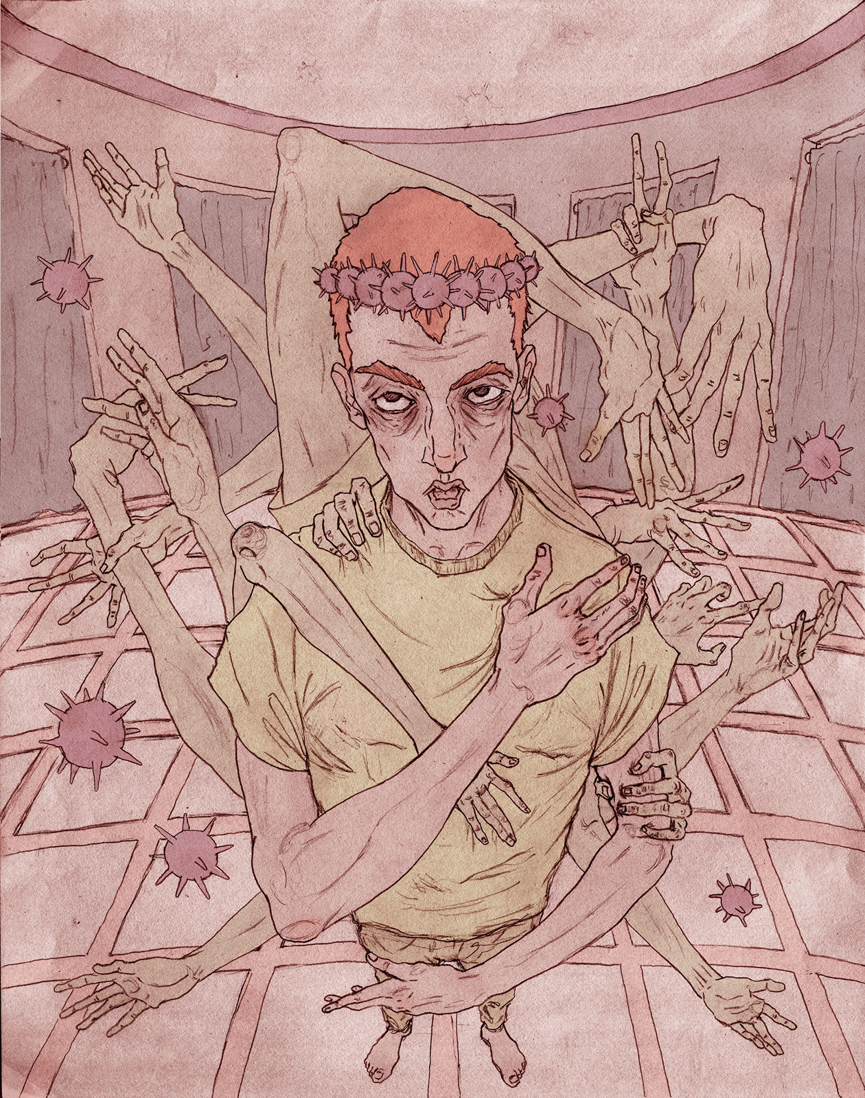 My series creates a narrative of those who are infected by the virus and the paranoia associated with the fear of contracting and spreading it. The use of grotesque figures is employed to personify the trepidation of one’s deepest nightmares linked to this pandemic. One such influence on the use of distorting the subjects in each piece is Egon Schiele, who used similar methods in his work to explore ideas of death, illness, and mortality through the human figure. Egon Schiele had passed away during the Spanish Flu pandemic a century prior to the one taking place today. Consequently, the aforementioned themes and his stylistic influence were selectively utilized as a form of homage when approaching the subject matter of human mentality during a pandemic. Furthermore, this series employs the use of traditional media as well as digital to act as a portal between Camus’ and Schiele’s time and experiences, to compare and contrast those occurring in present day. This motif is further emulated through the muted “fever-dream” colour palette in each piece. Utilizing modern illustration techniques on aged paper to create a connection in time as well as a form of documentation of society’s current experiences. Specifically, the fears we have today are recorded in the four pieces: