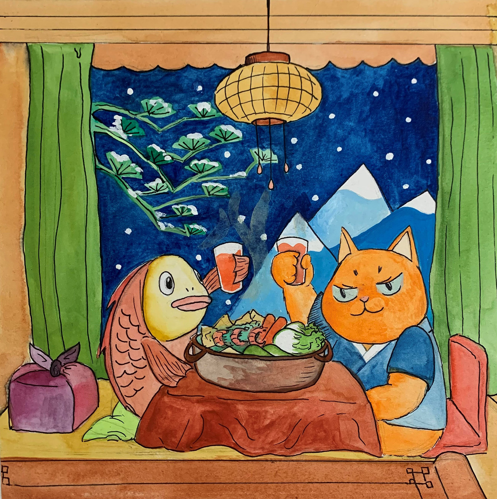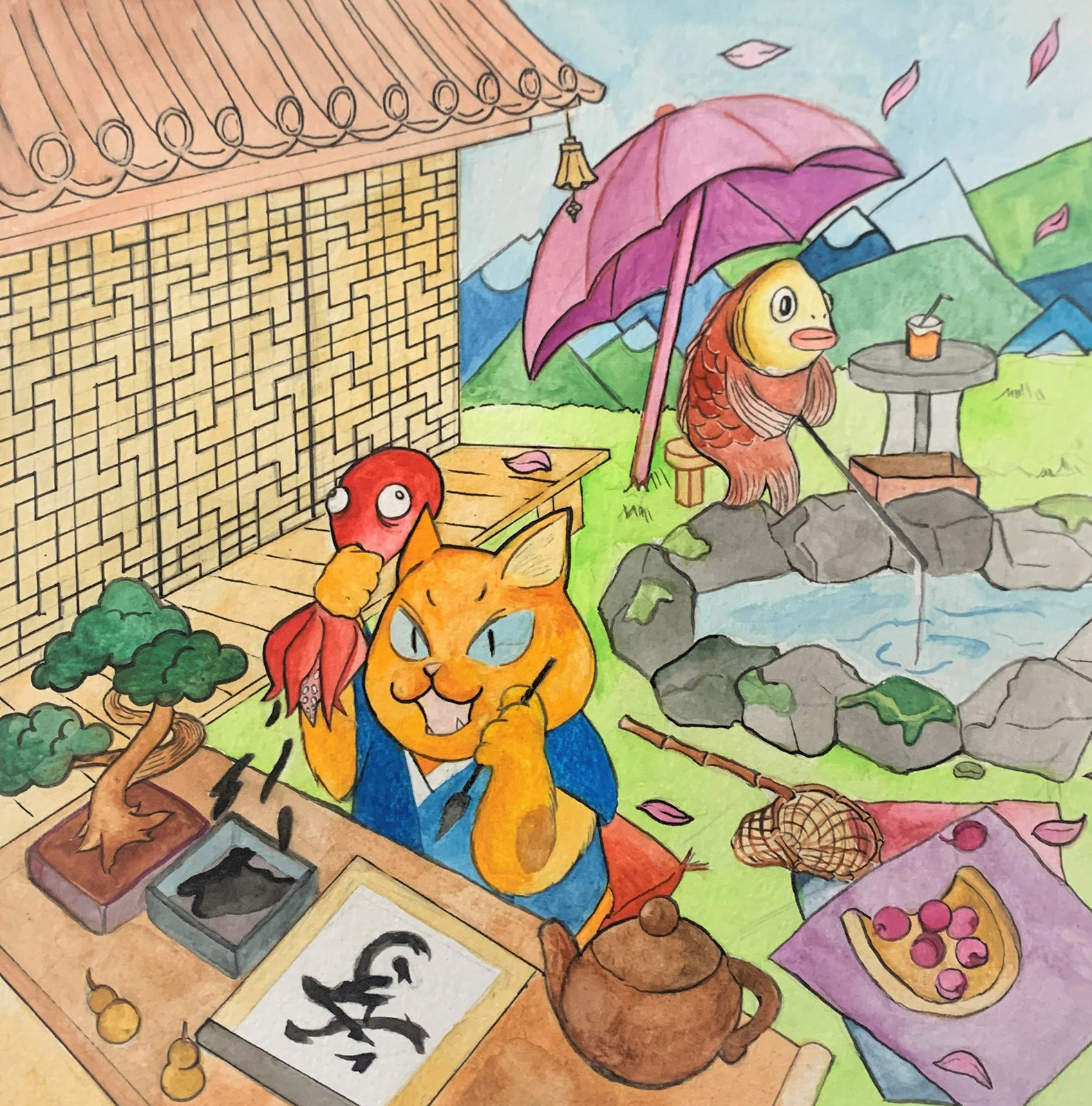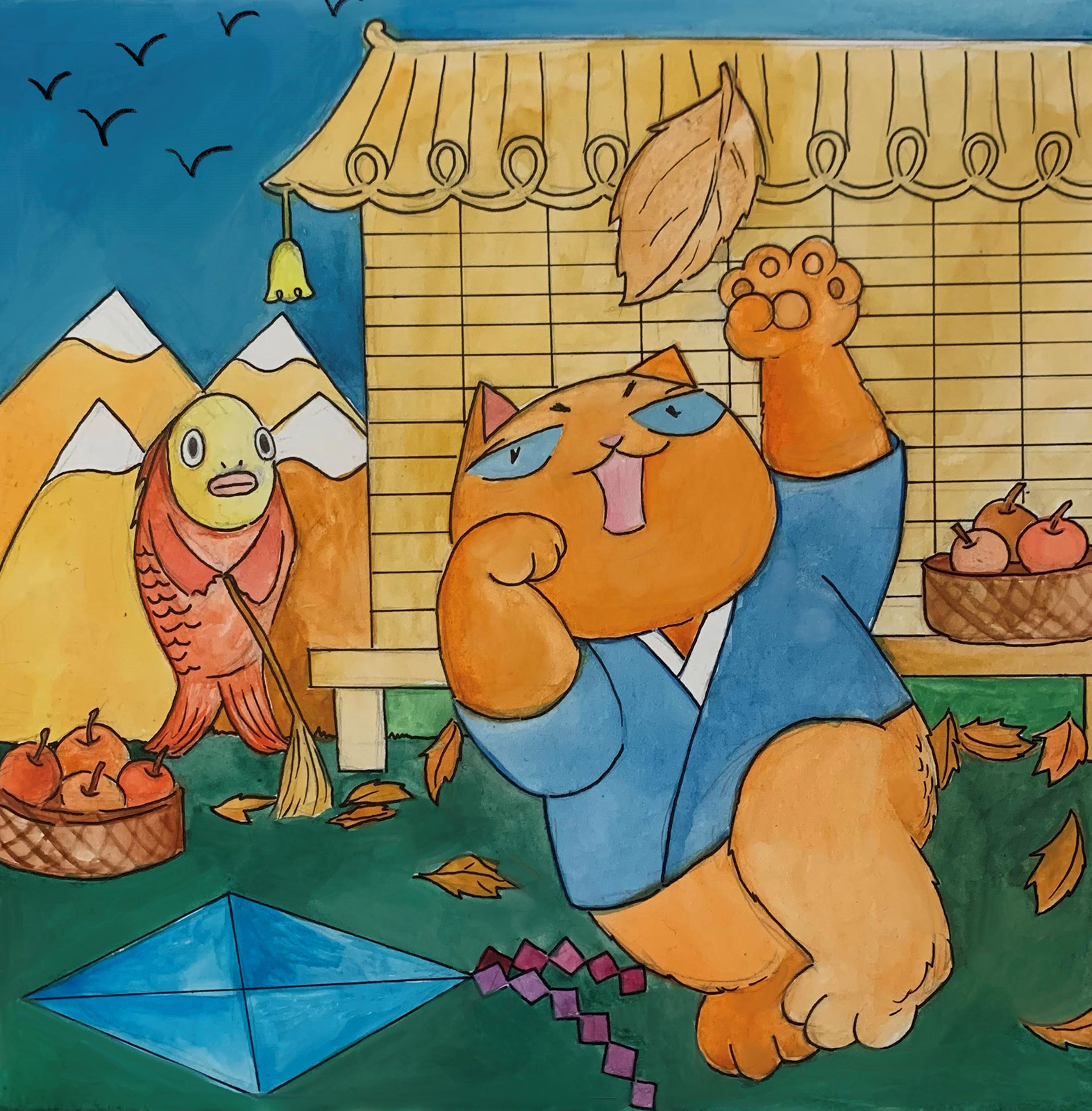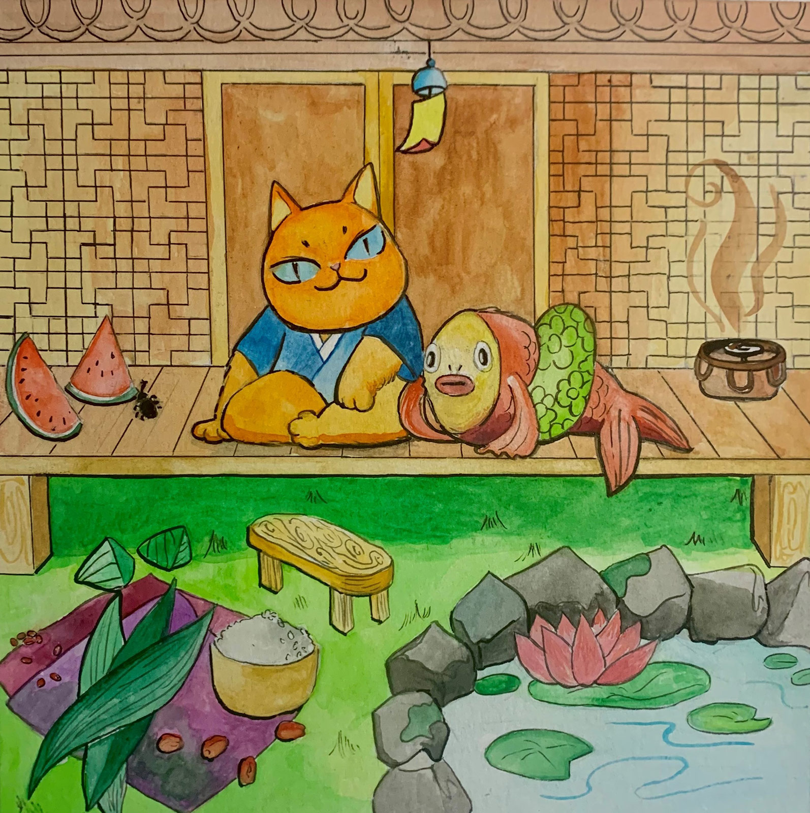 The narrative in my painting series is divided into spring, summer, autumn and winter. The protagonists, Cat and Fish, abide at their homes. The environment and the costumes for the characters are inspired from my own cultural background. I combine Chinese architecture with some Chinese festivals. In “Spring”, I added harvested plums, fishing, and falling petals painted in the colours of light green, light pink to show the lovely spring. In “Summer”, I added lotus flowers, watermelon and zongzi, a sweet glutinous rice cake from the Chinese Dragon Boat Festival. In “Autumn”, I added the fallen leaves, kites, harvested apples with deep yellow. In “Winter”, I added snow falling late at night, the pines outside filling with snow, and the warmth inside.
