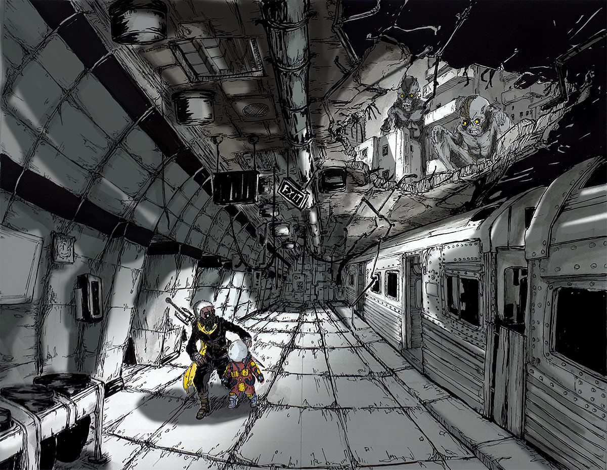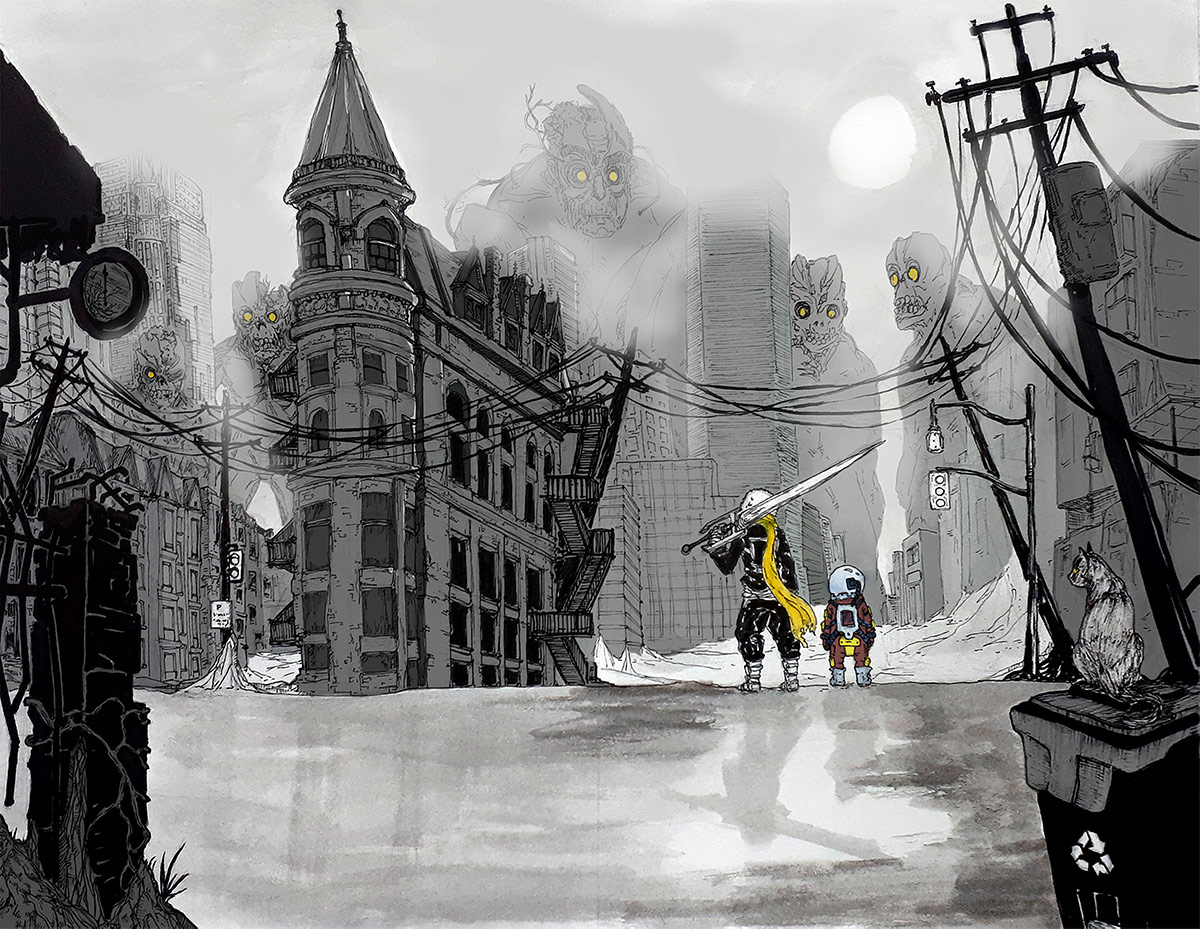 The story of this Memento Mori involved two characters in a threatening world. They live in constant fear of how to survive. Their situation mirrors my own life inside a big city. Giants and Zombies are my favorite kind of villains in a story. They represent fearlessness and bravery which I feel that I lack. Giants stand tall without fear of the crowd. Zombies attack without hesitation grabbing all the opportunity available. I see these characteristics of bravery and confidence as essential traits for an artist.