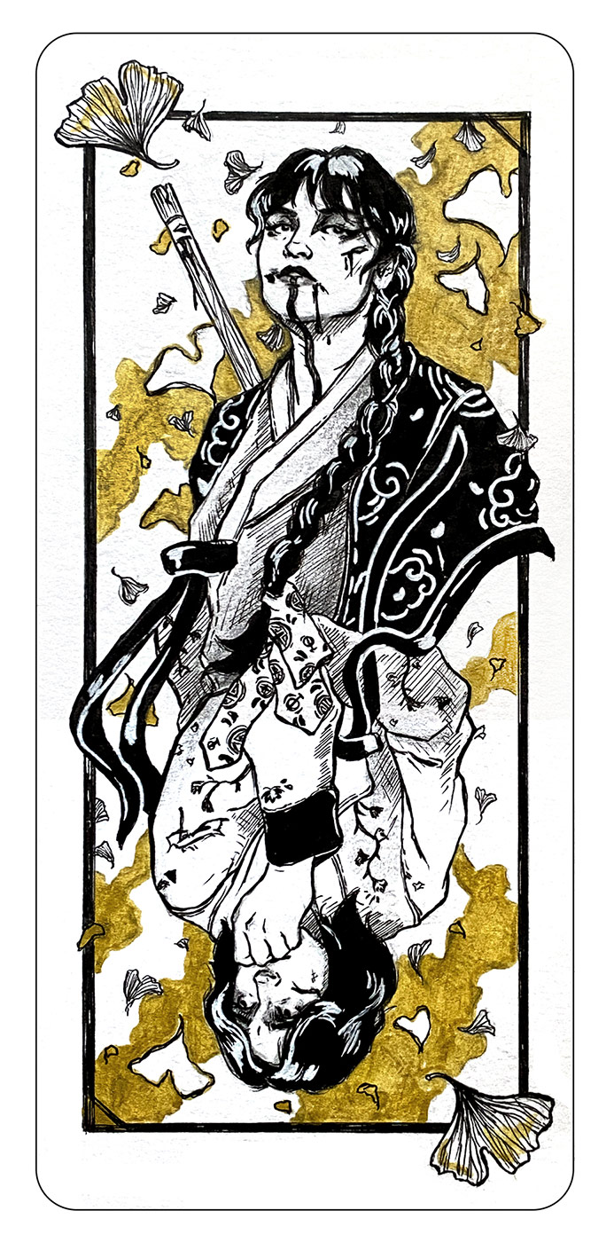 In this series of illustrated cards, I explore my relationship with some of the characters I’ve created through the years. As I look back into the past, searching for the hidden meaning behind the origin of these protagonists, I soon realize they serve as mirrors of my turmoiled emotions and, through their visual configuration and backstories, they give me subtle clues of what is really happening in my inner world.