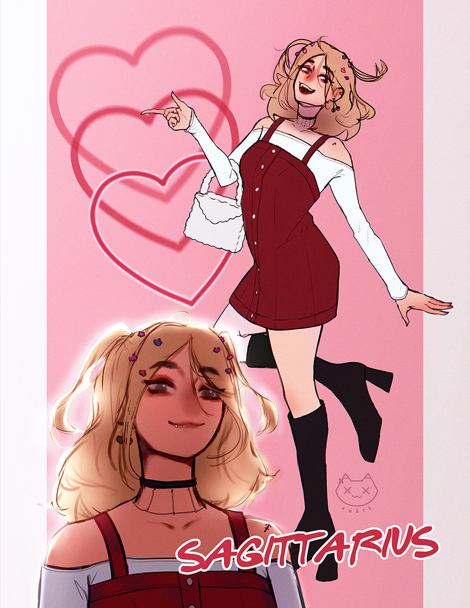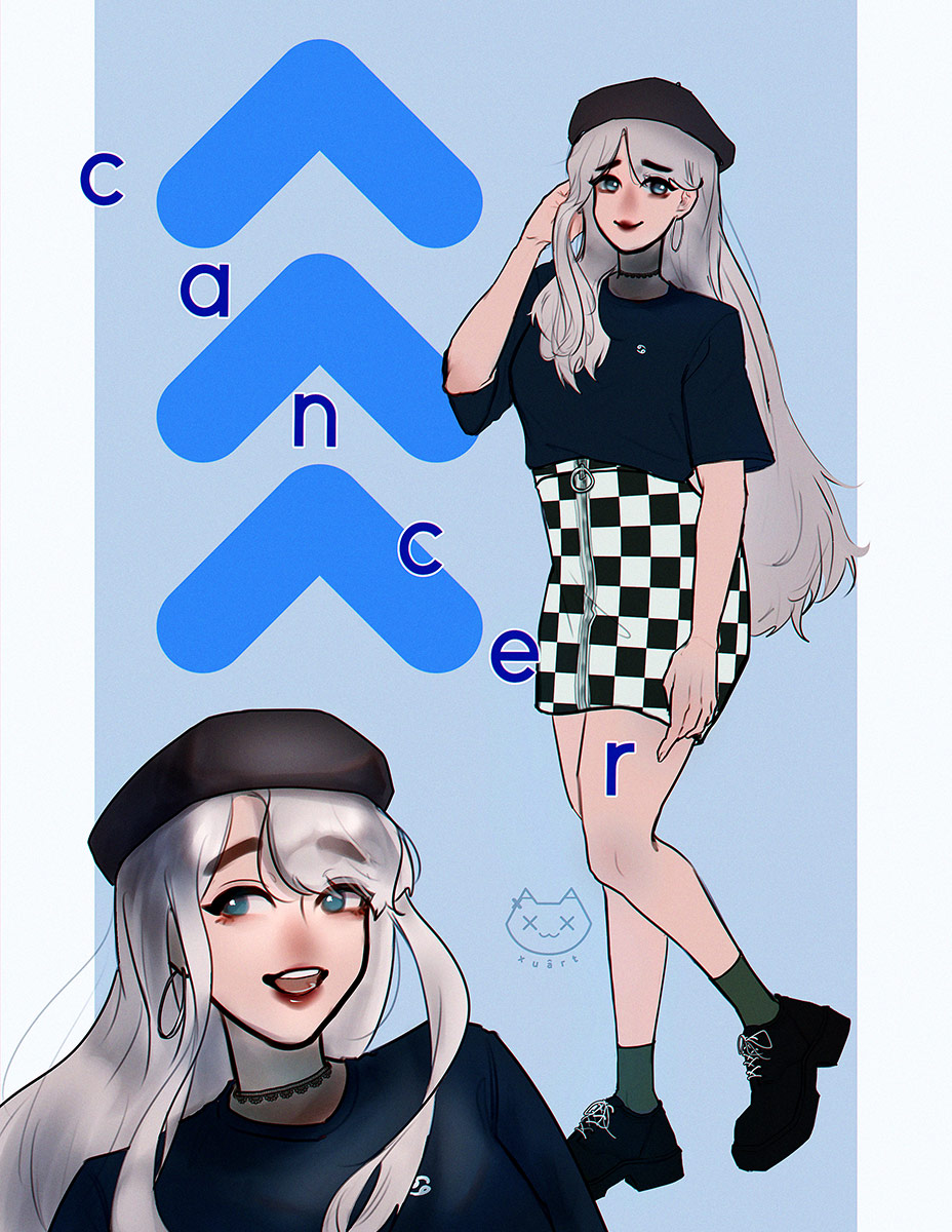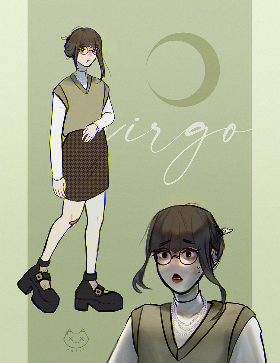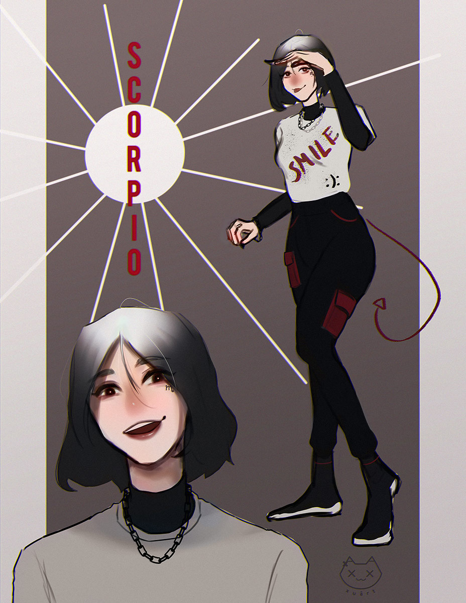 Zodiac Personification consists of four works of digital art, “Scorpi-bro”, “The Overthinker”, “DaLover” and “Bubbly”. The concept for this series is about astrology and the different zodiac signs in my personal natal chart. The subject of each piece is one of my personas created from certain qualities that each planet or zodiac sign represents. First, the sun represents your ego, life goal and overall persona. For “Scorpi-bro”, my sun is in scorpio so I decided to create a persona that represented scorpio’s intensity and passion. Second, the moon represents your emotions and inner mood. For “The Over-thinker” my moon is in virgo so I decided to make this persona more meek and gentle. Third, venus represents the way you love. For “DaLover”, my venus is in sagittarius so I decided to make a playful and loving persona. Finally, your ascendent represents how you present yourself to the world and first impressions. For “Bubbly”, my ascendant is in cancer so I decided to make a more gentle, sociable type of persona.