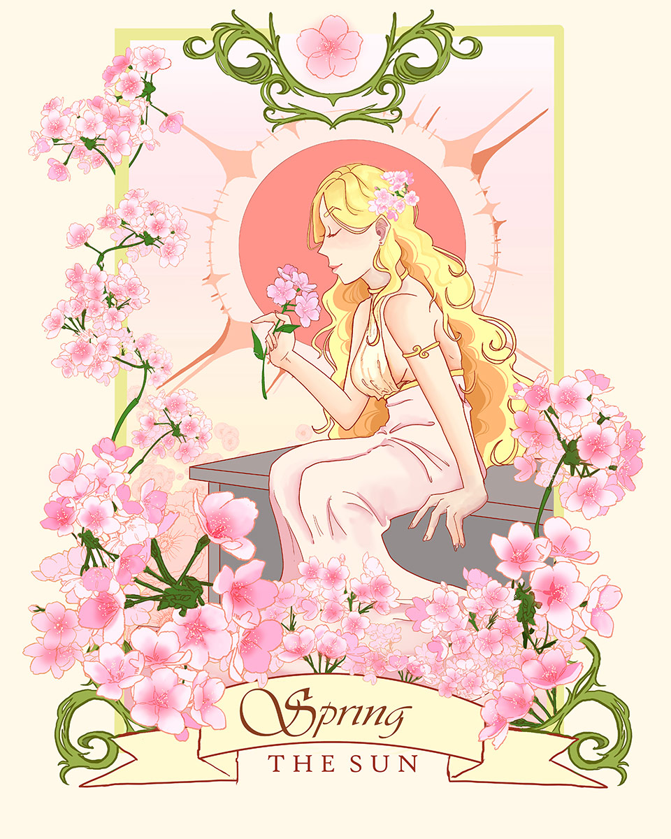 The first card in this is Spring: The Sun. This card represents the first significant change in her romantic life which is First love. This card shows a sense of naivety and starts with a sweet, pleasant feeling, but at the same time a hint of uncertainty is present. The Cherry blossom represents the love and female’s charm of their strength and beauty but it also represents fragility as one’s first love usually does not work out.