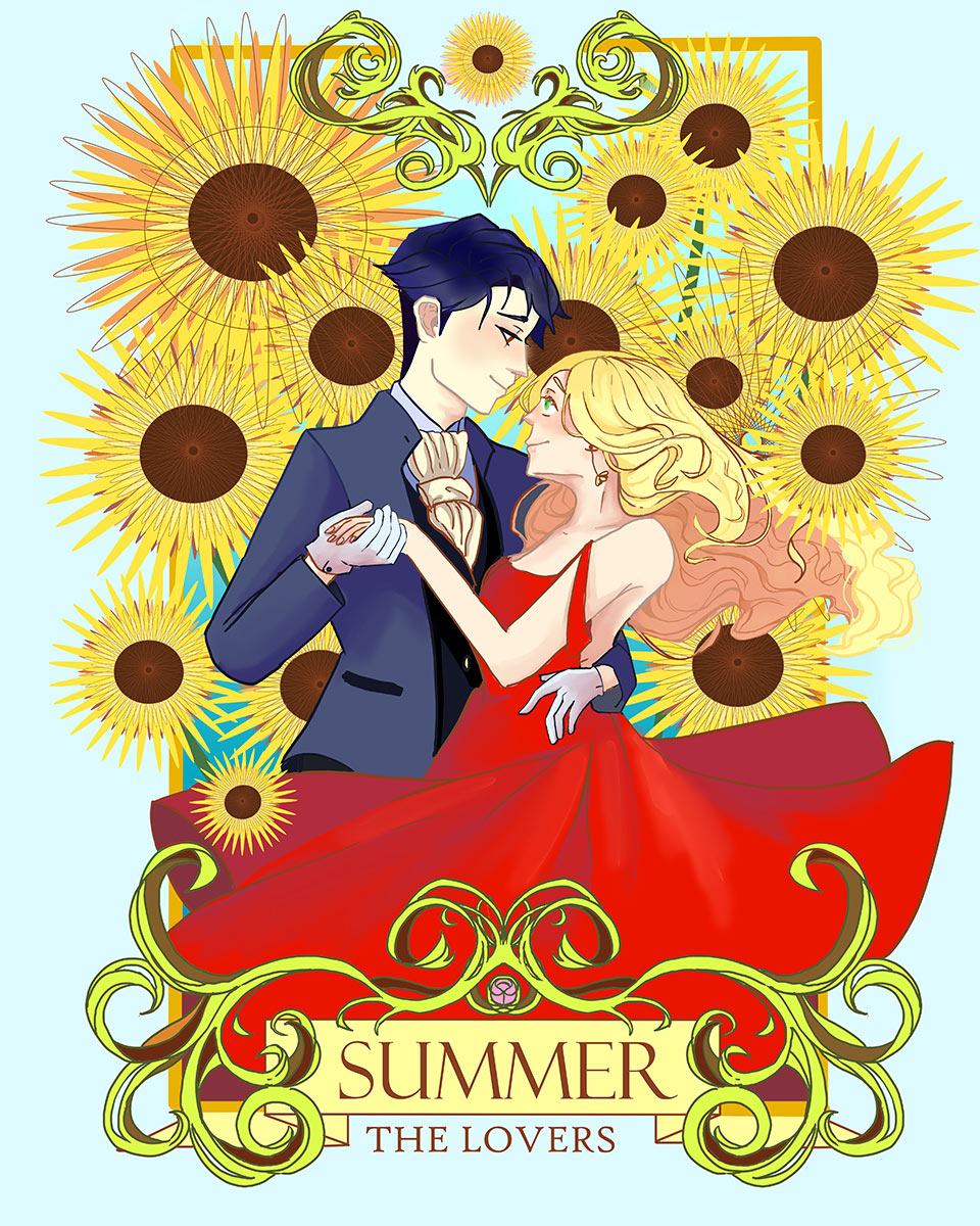 The second card Summer: The Lovers, signifies the concept of love is blind, it is a card that many people can relate to in the early stages in a relationship. This card represents passionate love, she can only see all the good things about her partner where she is unable to see all the red flags being raised. Making her look foolish yet so beautiful at the same time. The Sunflowers in this series embodies deep love and sincerity, as well as represent happiness and positivity just like the sun.