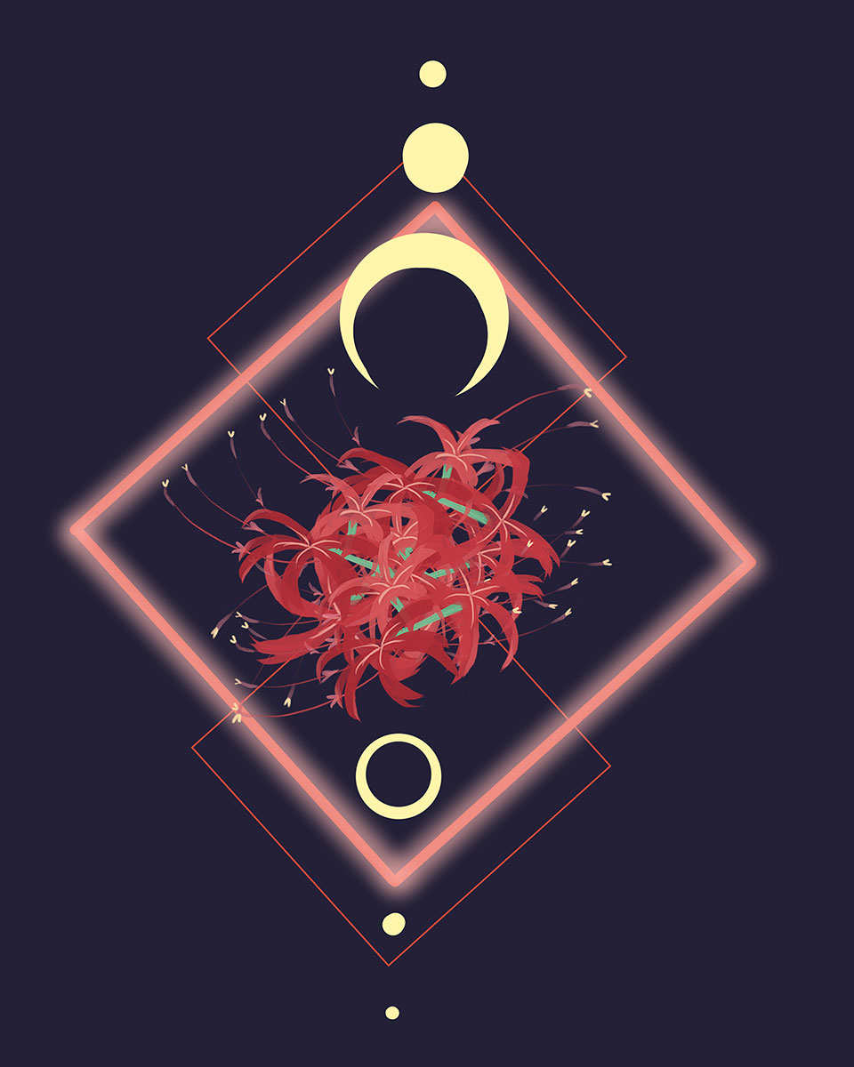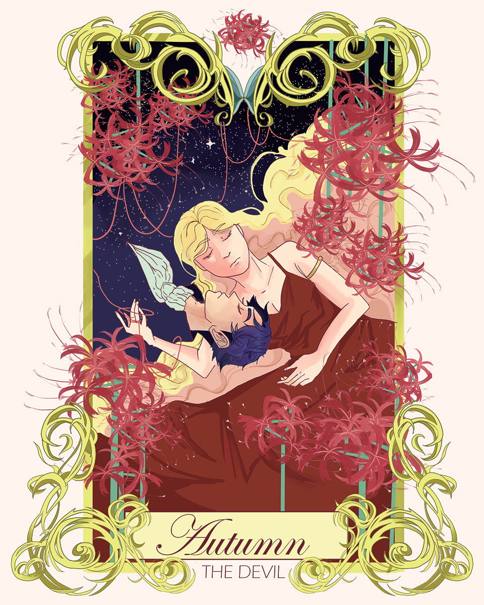 The third card Autumn: The devil, represents a transformation in her relationship as this card reflects falling out of love, where the romantic intensity from the Summer card is starting to cool off. The Flowers used in this illustration are Spider Lilies symbolizing departure or farewell and broken red strings to represent a wilting relationship.