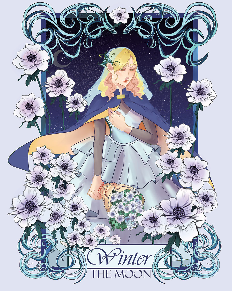 The final card in this series is Winter: The Moon, representing the sorrow and misery of losing the relationship. This card is a complete contrast to Spring, comparison to the joyous disposition of the first card, winter holds a mourning expression. This card represents a transformation of oneself to become stronger. The flowers used in this card are Anemones symbolizing Death and bad luck but it also represents passing of time and sincerity.