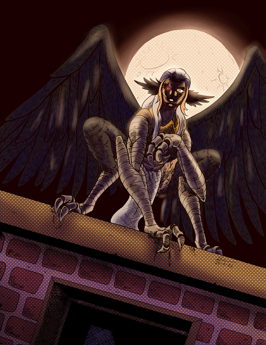Pestilence is the first of the Horseman I’ve represented. Diseases are commonly airborne so the association with air comes to mind. That led to associations with birds. Birds can be carriers of disease so the connection of birds, air, and disease are the basis of this portrayal. The image of a Harpy, a bird-like woman from Greek mythology, seemed perfect for Pestilence.