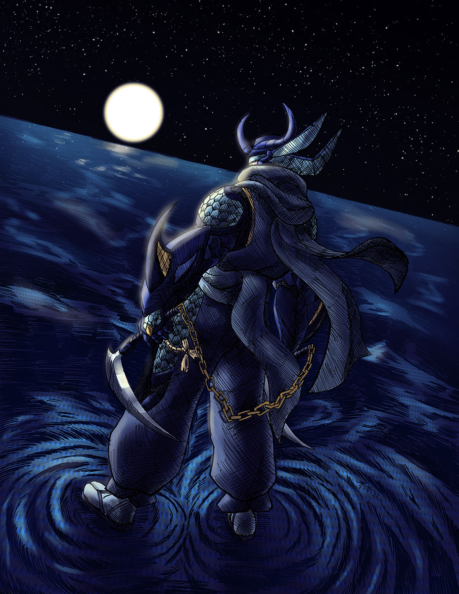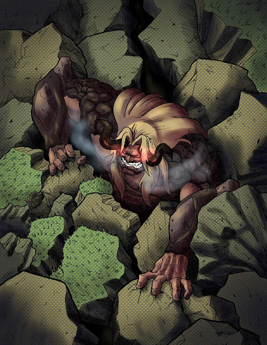I associate War with Earth due to how war is waged over territory and how war destroys the landscape. The portrayal of War is designed to evoke ideas of non-human beasts from mythology. War’s large horns and physique echo the design of a Minotaur.