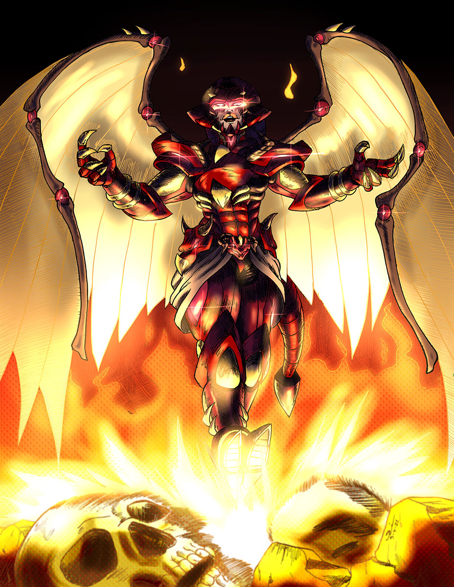 Death is designed to be a pastiche of fire, dragons, and knights. Fire and death share an interesting dynamic due to fire being responsible for life and death in many myths. Dragons have been known to be harbingers of death in mythology and various fairy tales. The visage of an armour-clad knight, specifically the Black Knight of mythology, can be a substitute for Death. These elements of fire and knights coalesce into the design of this image for Death.