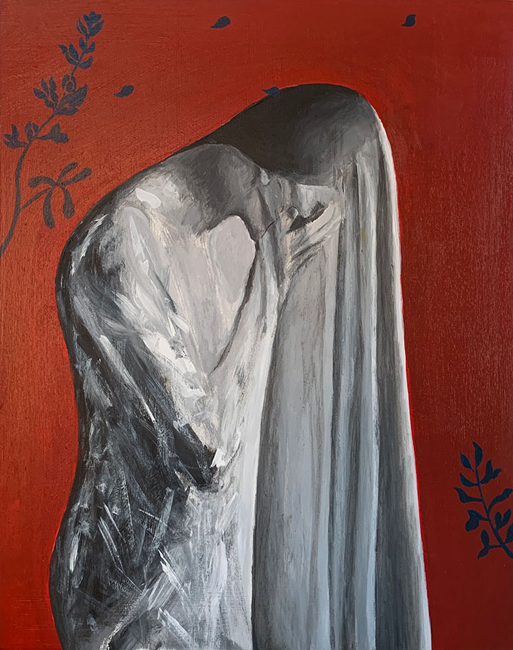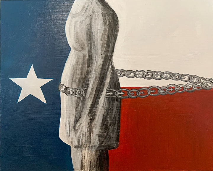 In the second series of work, Alone Star State, I respond to the recent abortion ban in Texas. Here I express my concern regarding the harm the anti-abortion law has brought to sexual assault survivors. I used symbolic and metaphorical approaches in this series. With a limited color palette and a combination of different brushstrokes, I tried to build a strong contrast between peace and chaos to get my ideas across. The illustrations were done with acrylic on wood.