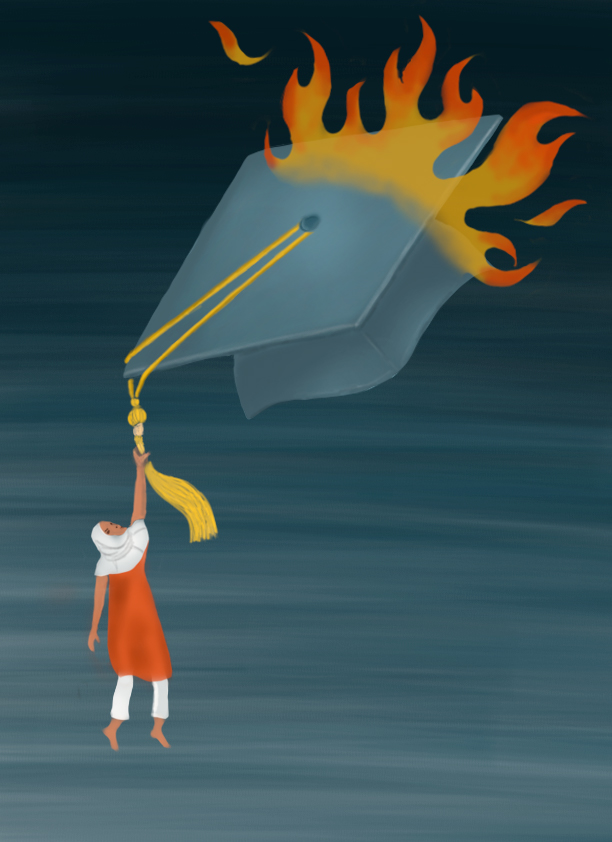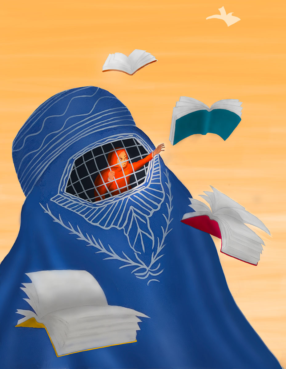 For these two series of illustrations, I explore the idea of women’s rights in Afghanistan and the United States. Although they initially appear like polar opposites, they might have more in common than you think. The first series is about girls’ educational rights in Afghanistan after the takeover of the country by the Taliban. The desperation and hopelessness I felt while reading recent news about Afghanistan led me to choose this topic and create this series of conceptual illustrations. Titled, Where’s My Book, the magazine cover depicts a girl trapped in a burqa-like prison trying to catch a book that is flying away. For this illustration, I used visual rhetorics like replacement and scale to construct my message. As for the work process, I started sketching the concept on paper, applied gouache afterward, and eventually finished up the details in Photoshop.