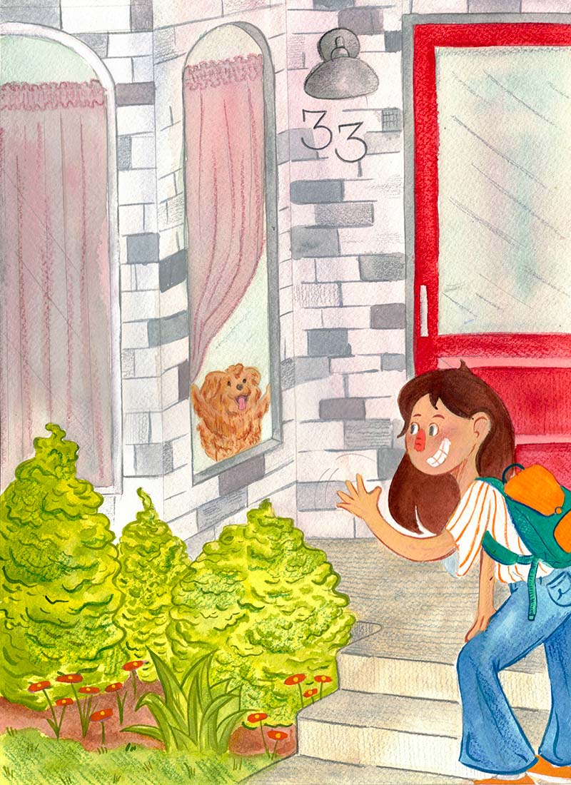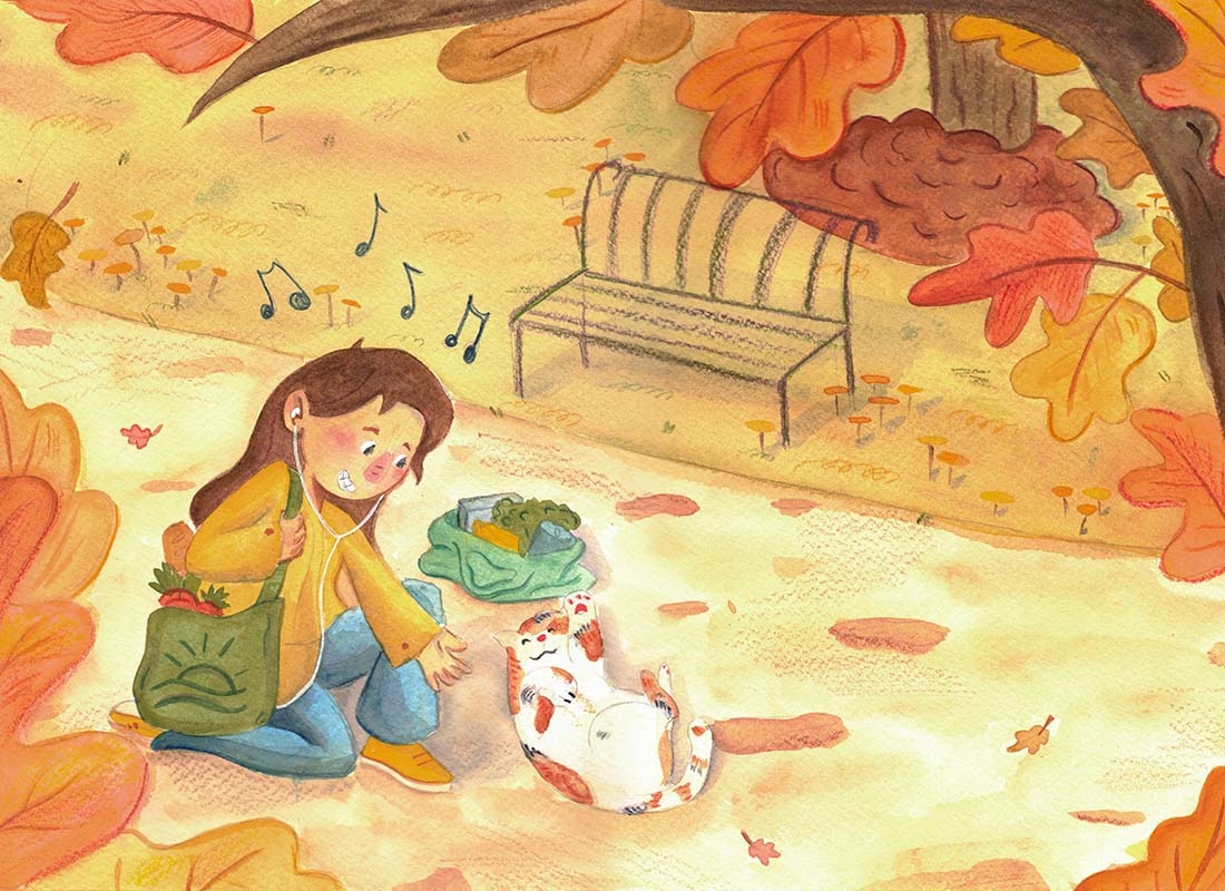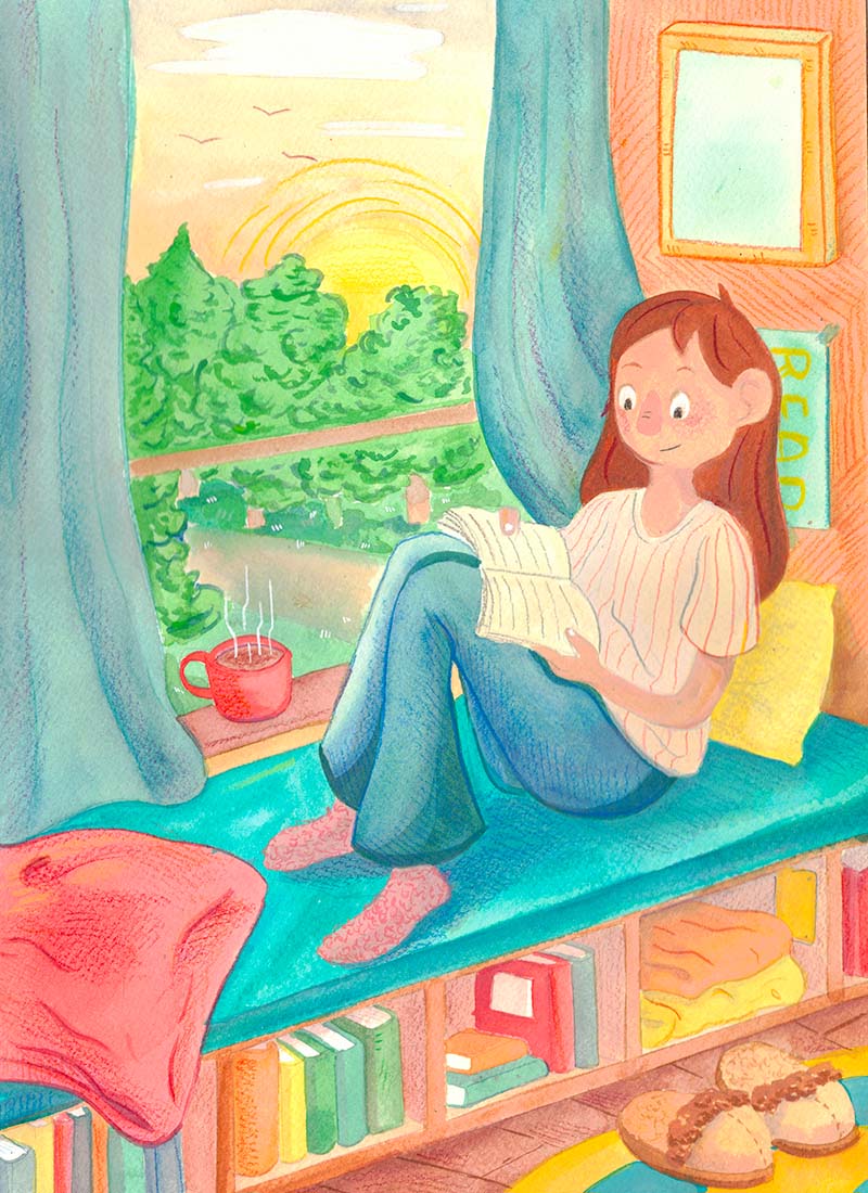 To research this series, I started by asking people what they like to do in their free time and also thought about my own leisure activities. Several responses focused on the moments that we don’t have control of; such as running into your neighborhood cat as you walk to the store. Other responses talked about the moments when we consciously make the decision to prioritize ourselves; such as indulging in our favorite hobby. In one illustration, I portray a moment we don’t control but rather anticipate; when you come home to see your pet waiting excitedly for you in the window. Another illustration, drawn from personal experiences, depicts a girl coming across the neighborhood cat on her walk. The last two illustrations depict moments that we create for ourselves; such as indulging in some baked goods; and finally settling down with a good book and a warm drink in the early morning when the air is still crisp. I want the audience to look at these illustrations and be reminded of the little moments that they may plan or come across in their daily lives.
