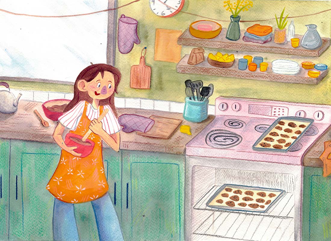 I used traditional mixed media for this illustration series. I explored various color schemes as well as wet and dry media options before settling on a mixture of watercolor and pencil crayon on hot-pressed watercolor paper. I used to think that pencil crayons were often an overlooked media because they’re usually viewed as something only children would use. However, through my time exploring the world of children’s illustration, I’ve come to enjoy this traditional medium and all the different effects I can achieve with it. Now I view colored pencils as a warm and comforting media which is just the type of mood I aim to present in this series.