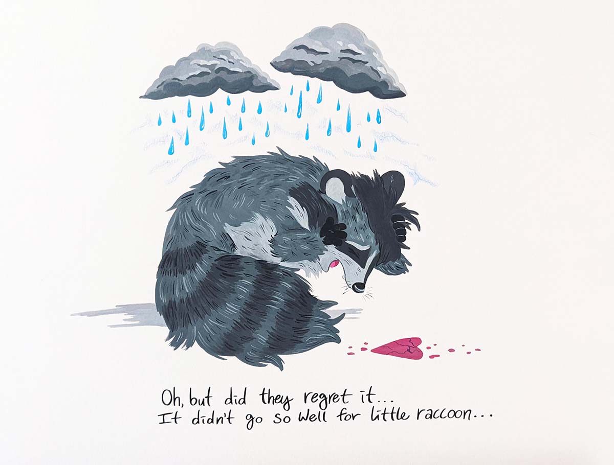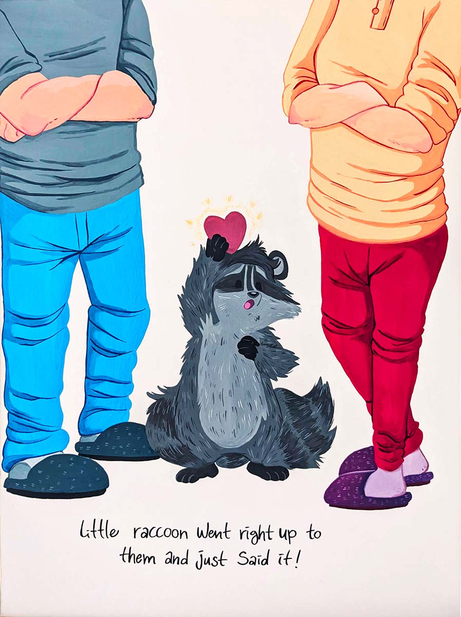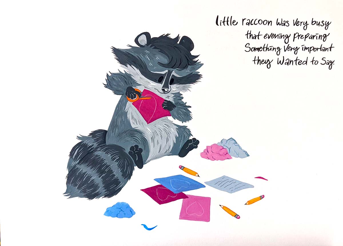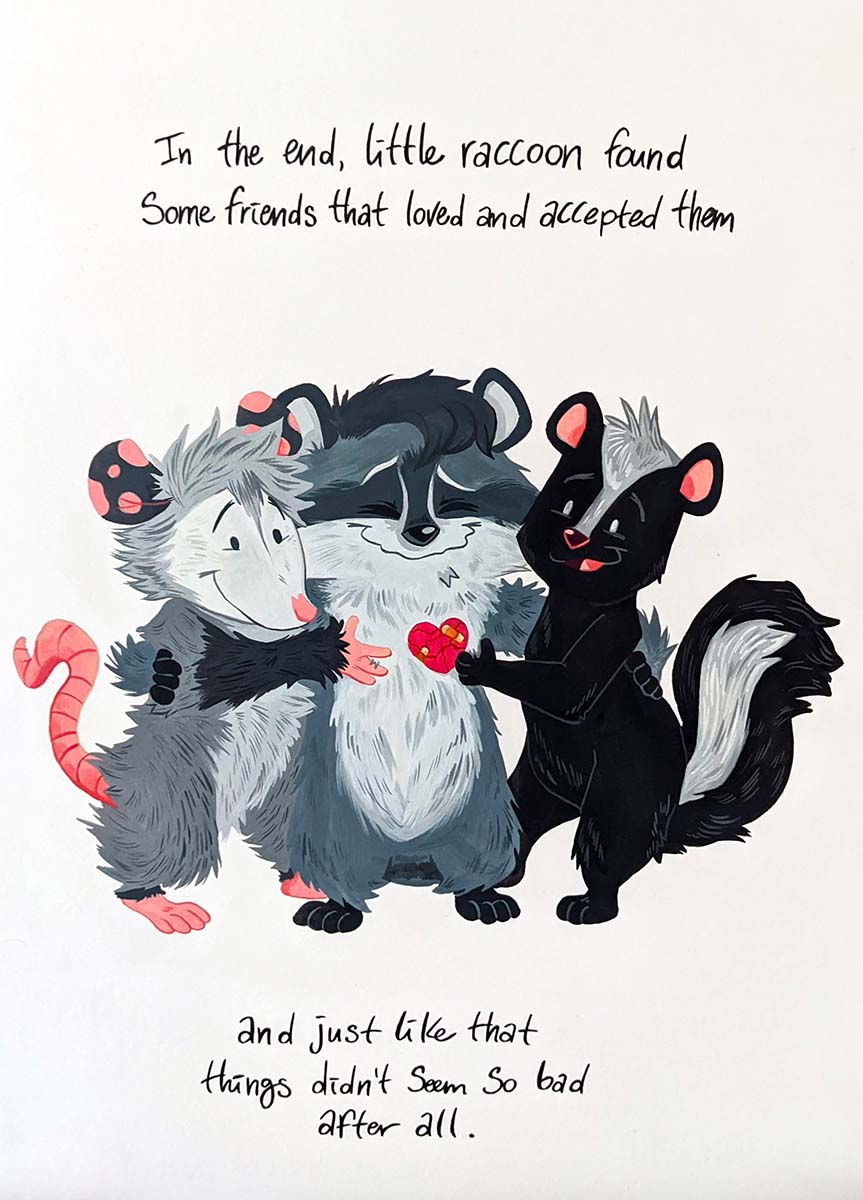 I chose to illustrate a raccoon character dealing with unsupportive people and yet ultimately finding company with others like them. To many humans, raccoons are seen as a pest and not wanted. Same goes for the other animals I chose to illustrate, the opossum and the skunk. The concept of the little raccoon who finds friends who like them for who they are is a meaningful analogy for finding acceptance in the LGBT community. The cuteness of the animal characters and the symbolism of a paper heart makes my narrative accessible to a more general population outside of the LGBT community.