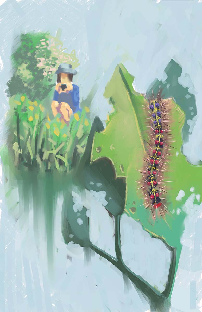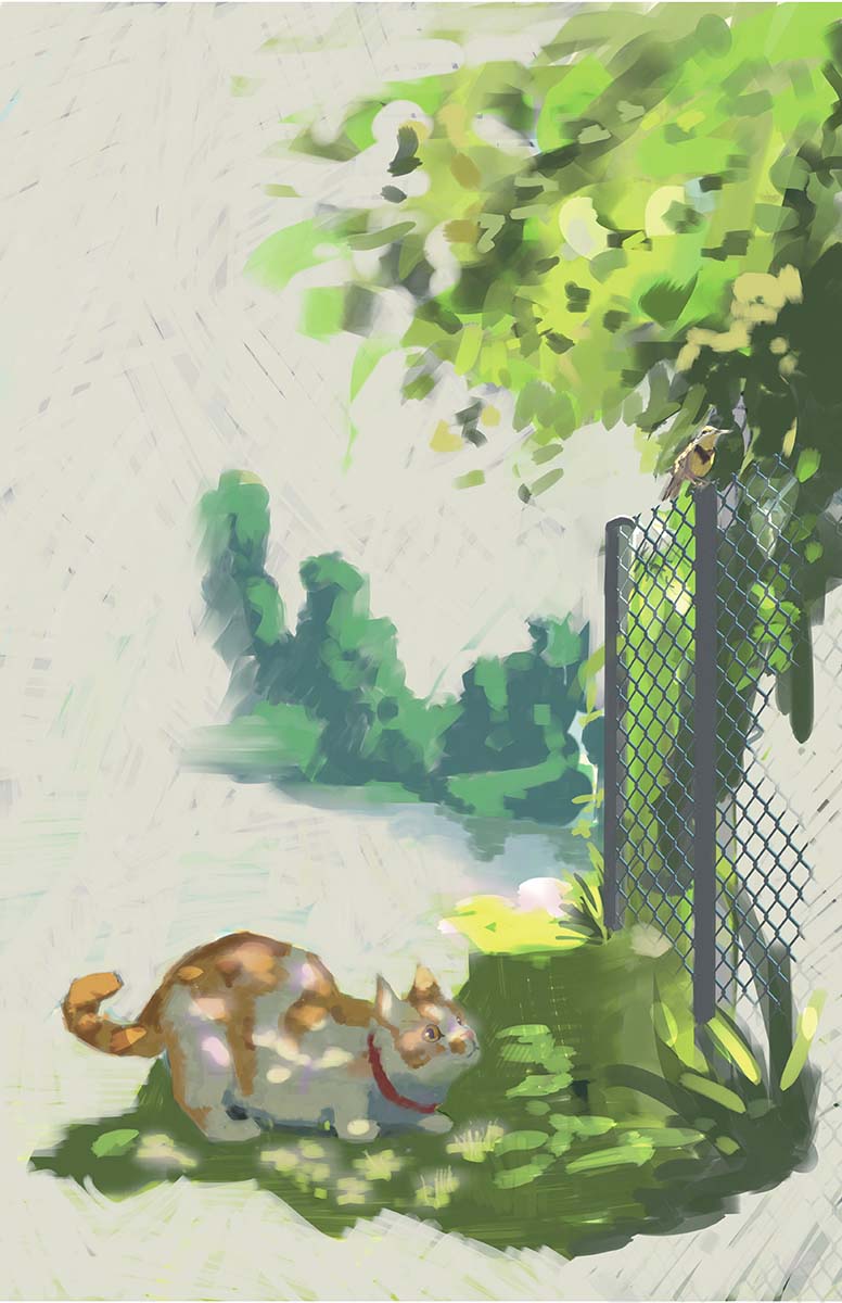 Nature and animals are the main focus in all four pieces. With each piece, I explore different aspects of the presented issue. The non-natives species depicted in my series are the spongy moth, introduced by Europeans in Eastern Canada to stablish a silk industry; the European green shell crab, which impacts marine plants; and the domestic cat, when in care of irresponsible owners, become a significant predator of other small animals, especially birds. I also want to show a native species in my work which are the Canadian Goose and the Meadowark.