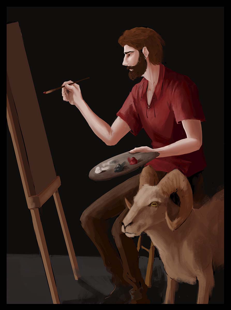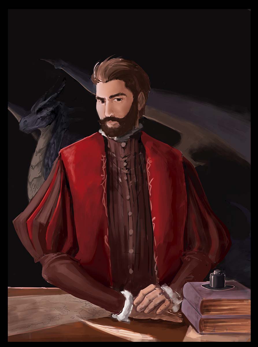Portraiture to me, is a comfortable approach to make a series of cohesive images that express something deep about myself. I have always put myself into certain stories, living through the character’s shoes and experience part of their story. I utilize classic portraiture methods from the past where artists left symbols and hints to describe the subject’s personality and achievements. I include surrealistic elements connected to a fantasy setting. I enjoy drawing animals and fantastic creatures including some in all images for continuity across the series.