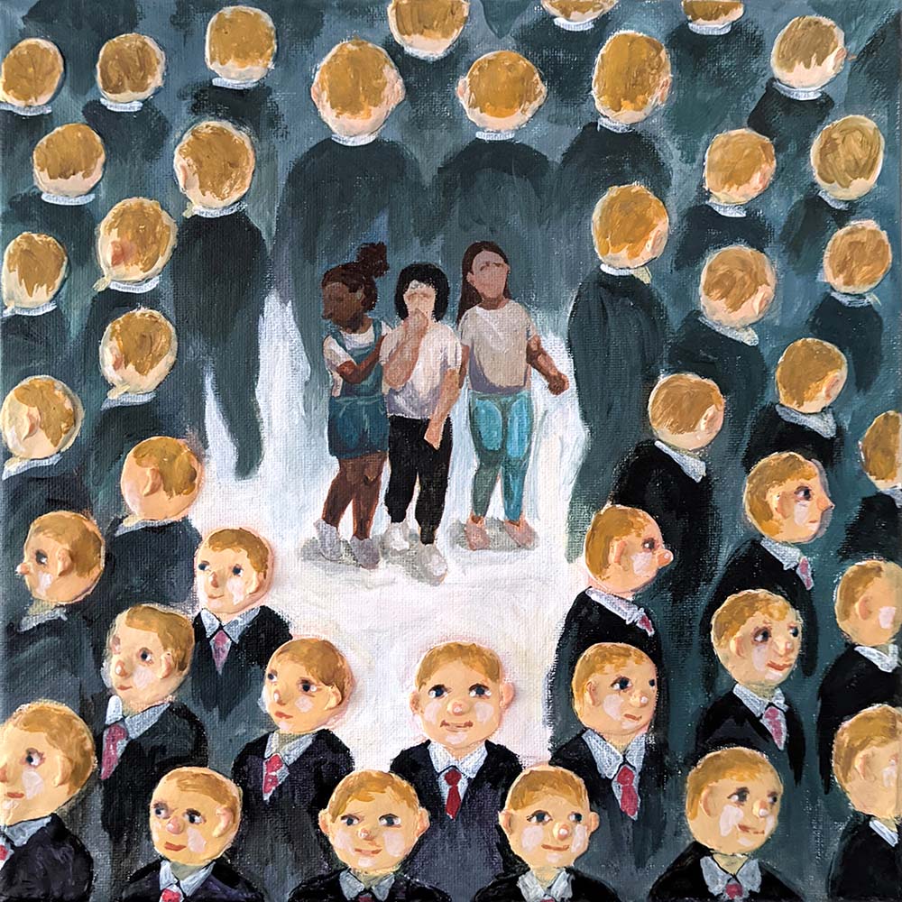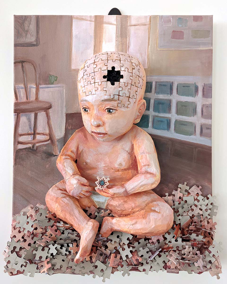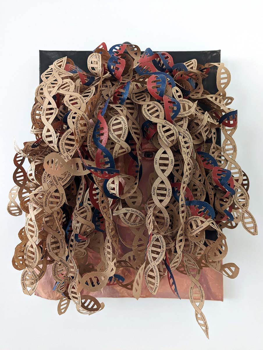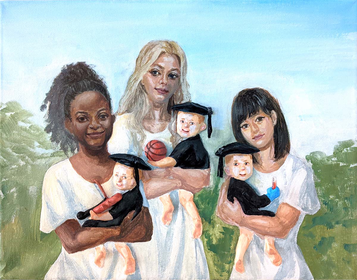 By listening to different perspectives, I have enriched my knowledge and thinking about designer babies. My illustrated series tries to make tangible some of the issues at stake. I have worked in mixed media using a combination of foam, aluminum foil, clay, and paper mâché to visualize the complexity and depth of the issue of designer babies. In my series, I use the graduation cap and suit to represent the high intelligence of designer babies. The disease puzzle in hand symbolizes giving the right to eradicate or keep the genetic disease. I hope audiences can try to understand the varied concerns of others when faced with such challenging problems in new genetic technology.