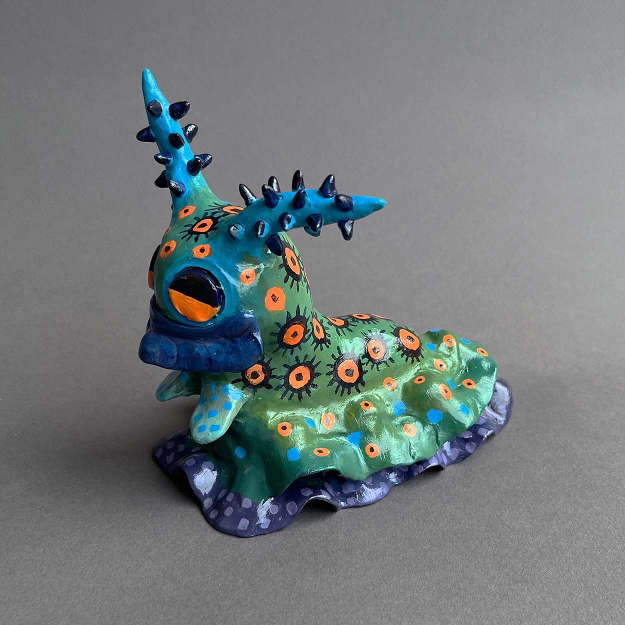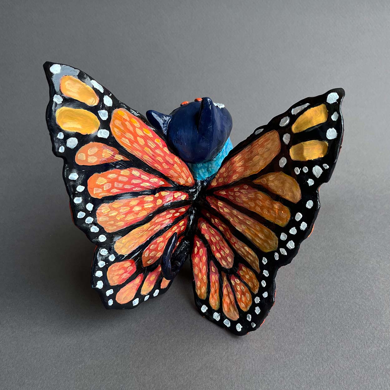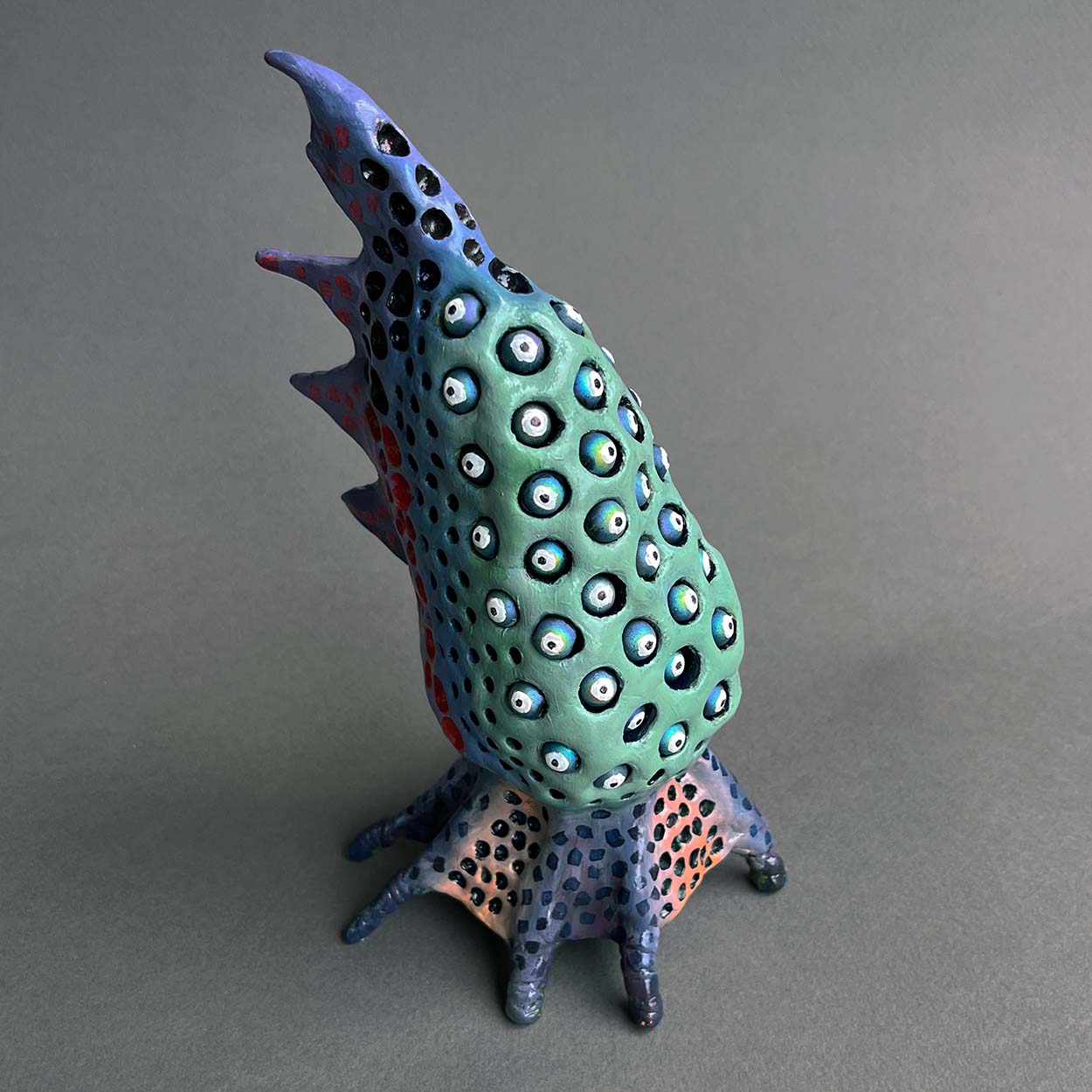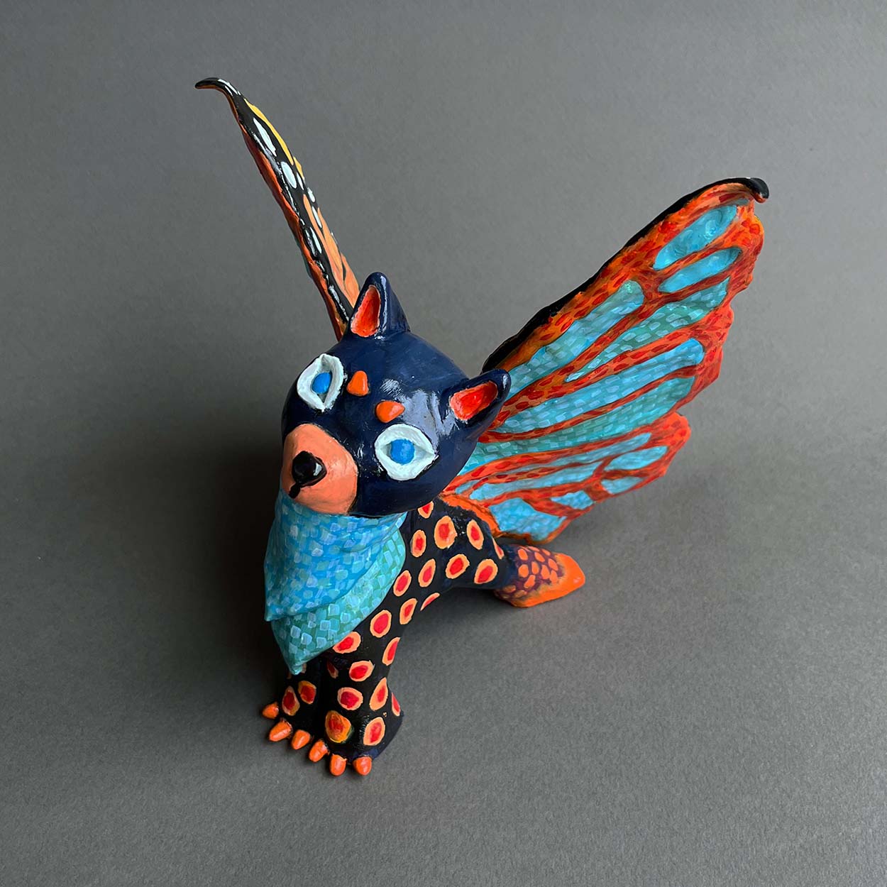 This project is a tridimensional visual essay to embrace emotions experienced in the process of change or “Hero’s Journey.” I used the phases of the butterfly cycle to depict different stages’ emotions. To make them less frightening for me, I chose to reimagine them into fantastical creatures, painting them with a limited colour scheme but squeezing as many colour variations as possible. I added the patterns that my variety of brushes allowed me and drew on to some other visual resources, such as trypophobia, to emphasize “fear” or “discomfort” in one of the phases. I was deeply inspired by Mexican folk art called “Alebrijes,” part of my culture.