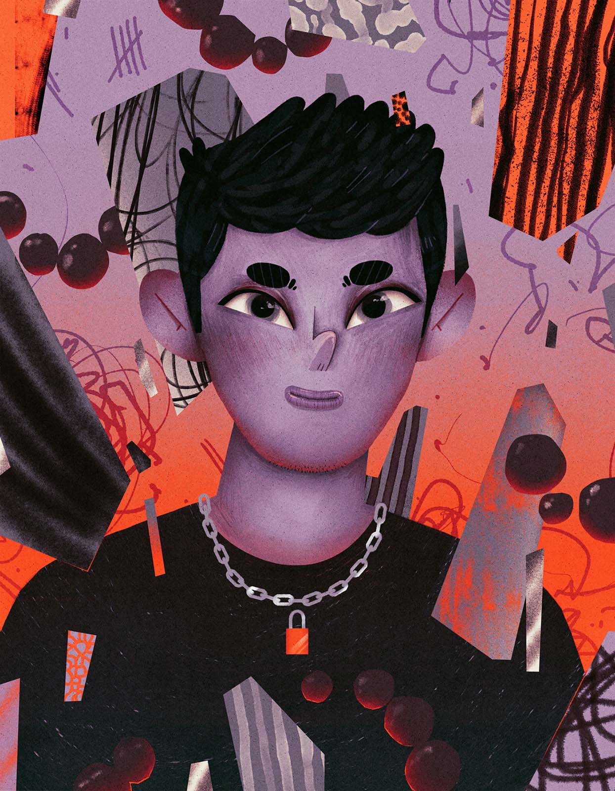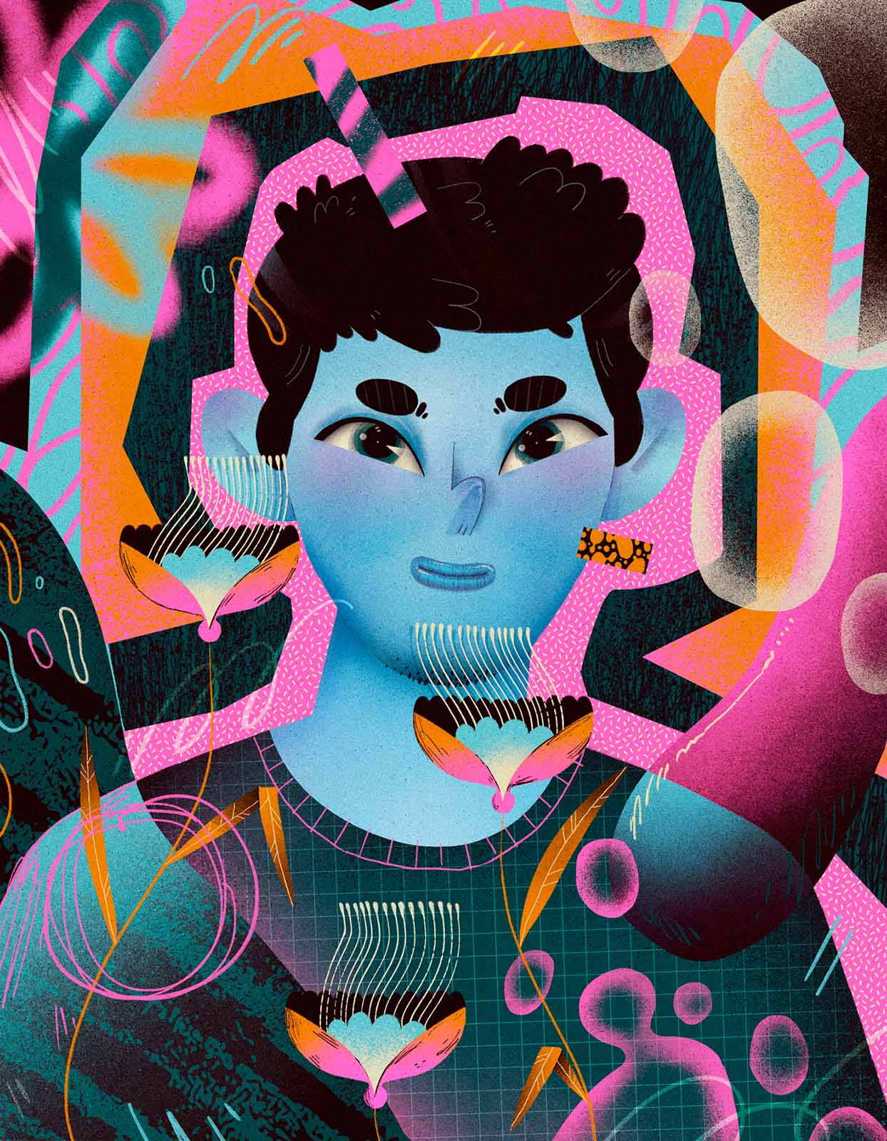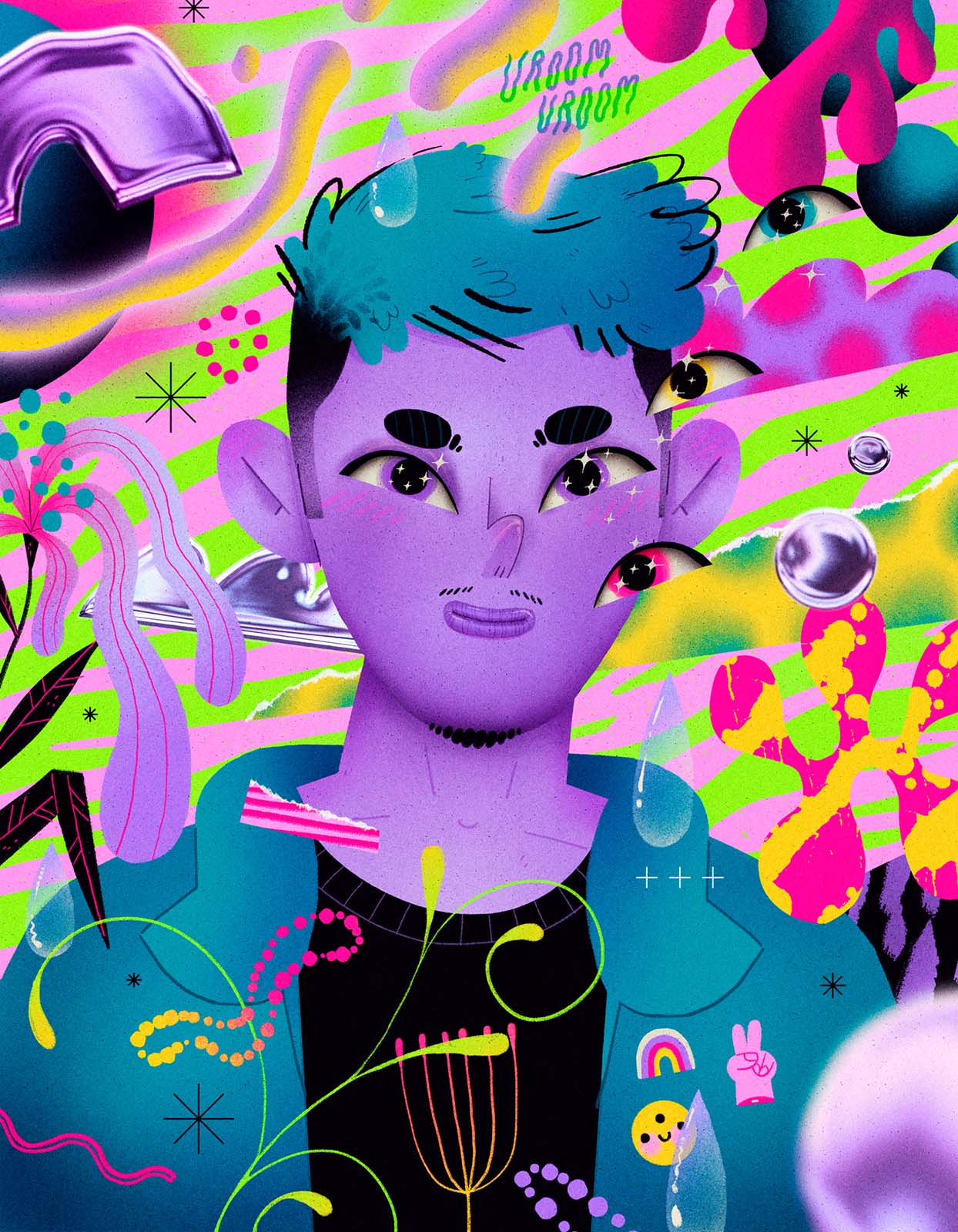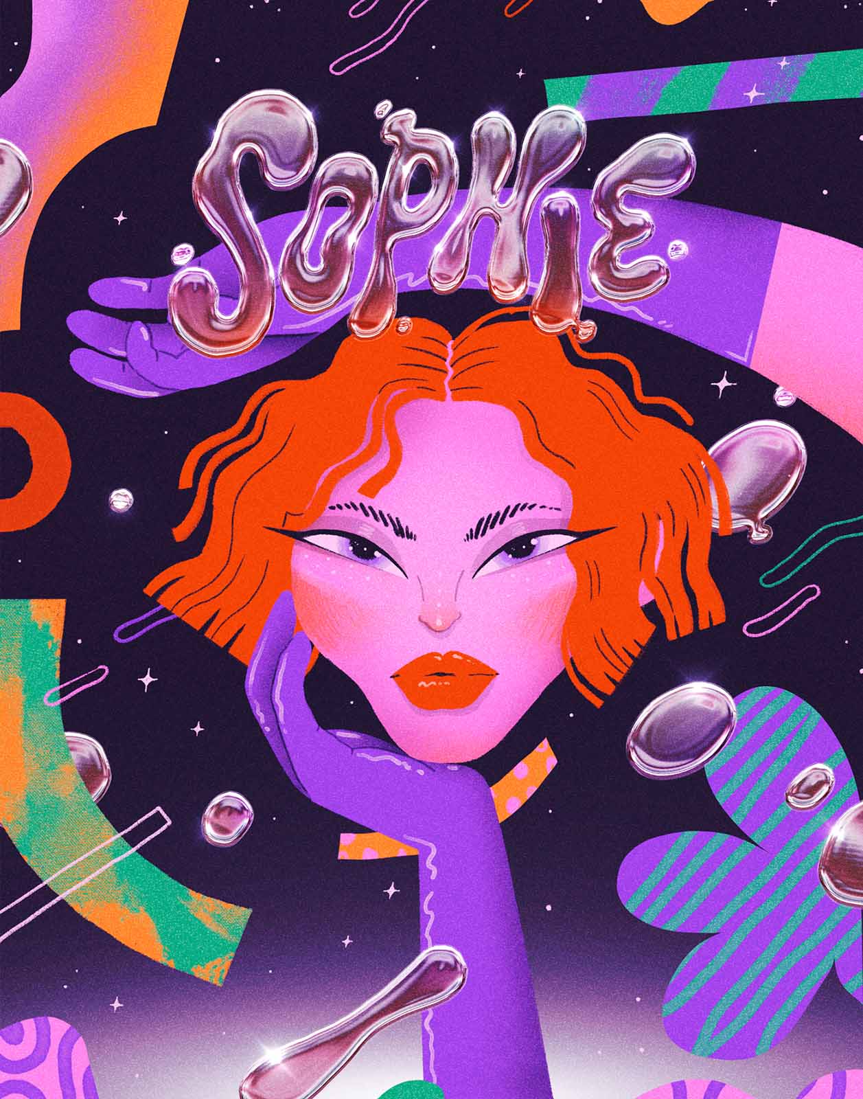In contrast, I’ve also included artworks from an editorial illustration project I developed alongside the four self-portraits. This other group of six illustrations are taken from the first issue of SOPHIE, a self-published, independent magazine. Named after Sophie Xeon, a trans DJ and producer who pioneered contemporary experimental electronic music, SOPHIE was created as an act of resistance, as an advocate of diversity and as a strong cry of pride. Its mission is to serve as a spotlight for queer musicians of the modern era and to amplify the voices of communities that need and deserve to be heard.