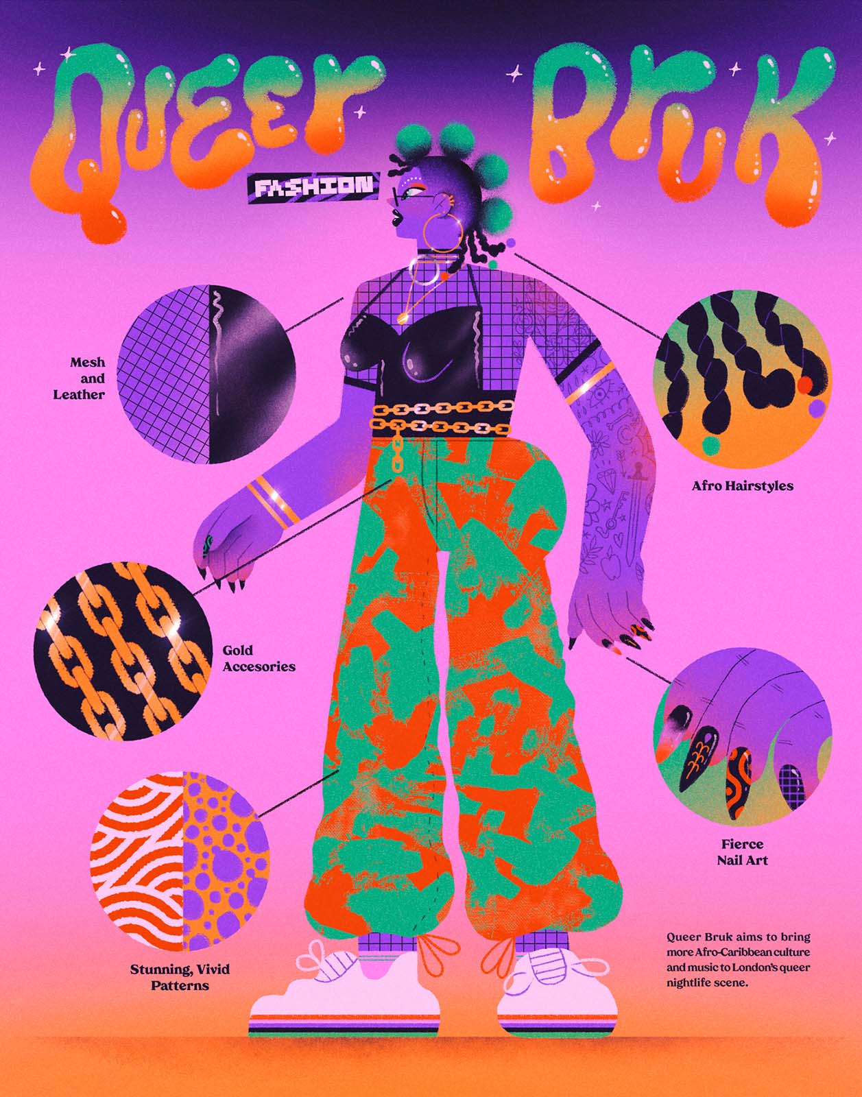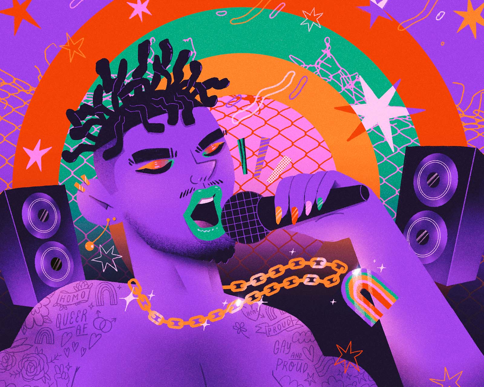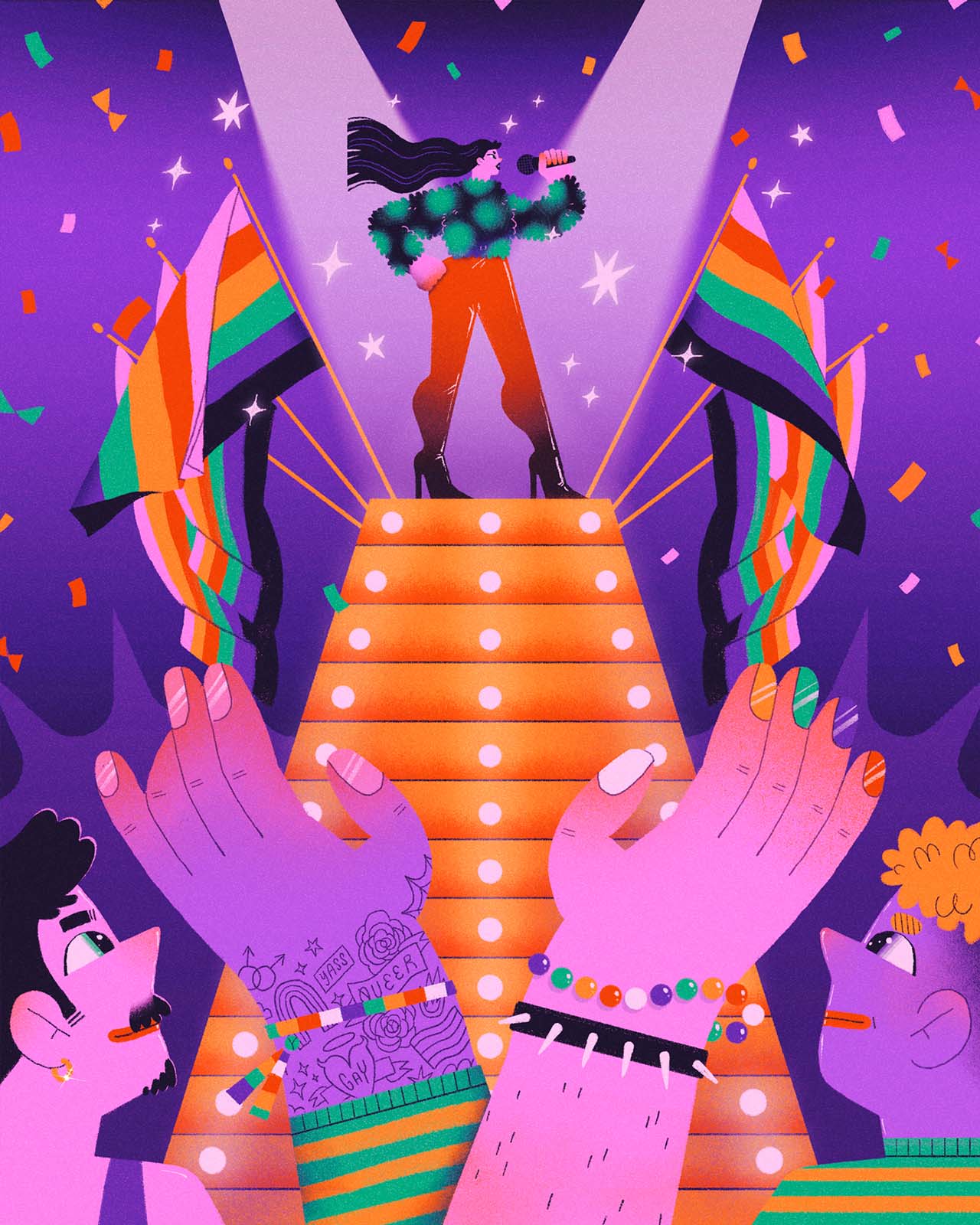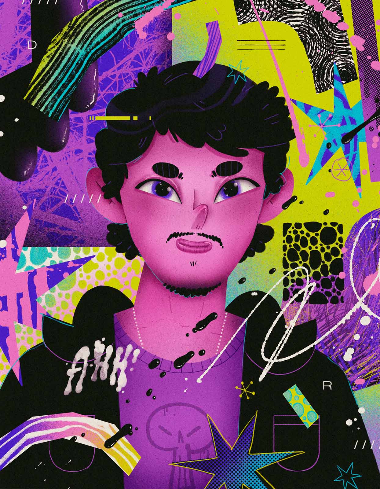 In contrast, I’ve also included artworks from an editorial illustration project I developed alongside the four self-portraits. This other group of six illustrations are taken from the first issue of SOPHIE, a self-published, independent magazine. Named after Sophie Xeon, a trans DJ and producer who pioneered contemporary experimental electronic music, SOPHIE was created as an act of resistance, as an advocate of diversity and as a strong cry of pride. Its mission is to serve as a spotlight for queer musicians of the modern era and to amplify the voices of communities that need and deserve to be heard.