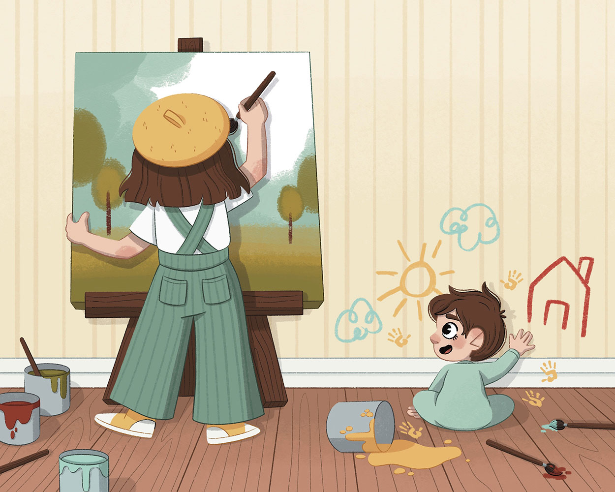 One of the biggest and most important influences in my life has been my experience growing up as a big sister. This series, inspired by my relationship with my little brother, illustrates what being a sister means to me. I have created four pieces, each describing a different role that I associate with being a big sister: Best friend, role model, confidant and protector. While creating these illustrations, it was important to me to depict sibling dynamics outside of my own in the hopes to generate a larger connection with my audience. These pieces were created digitally over the span of a few weeks. I incorporated textures that I felt were reminiscent of childhood – crayon, pencil crayon, paint- to create a more playful, handmade look. I hope that this series will give viewers an opportunity to look back into their own childhood memories and consider the experiences and relationships that may have shaped who they are today.