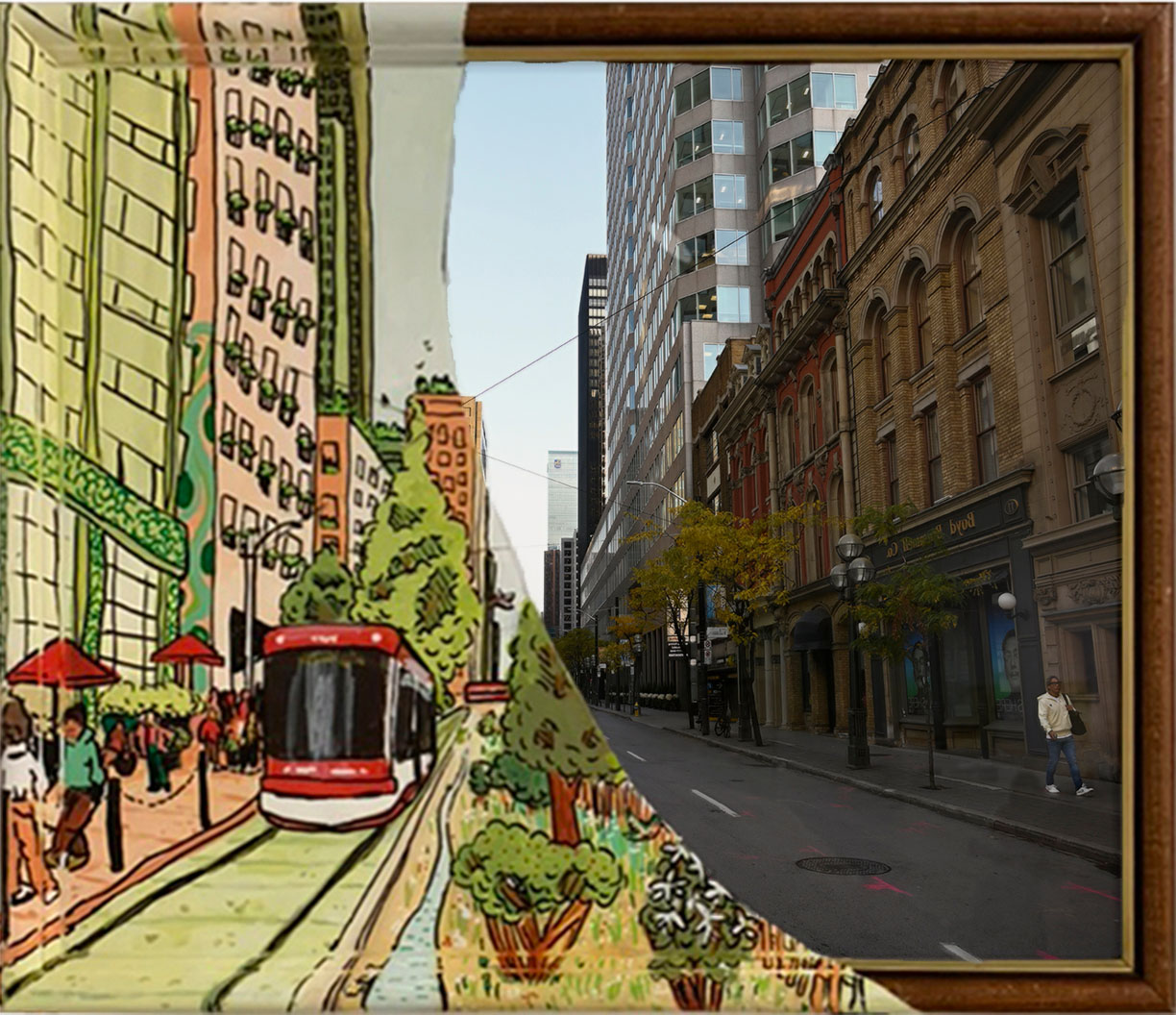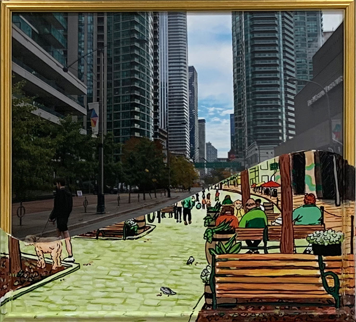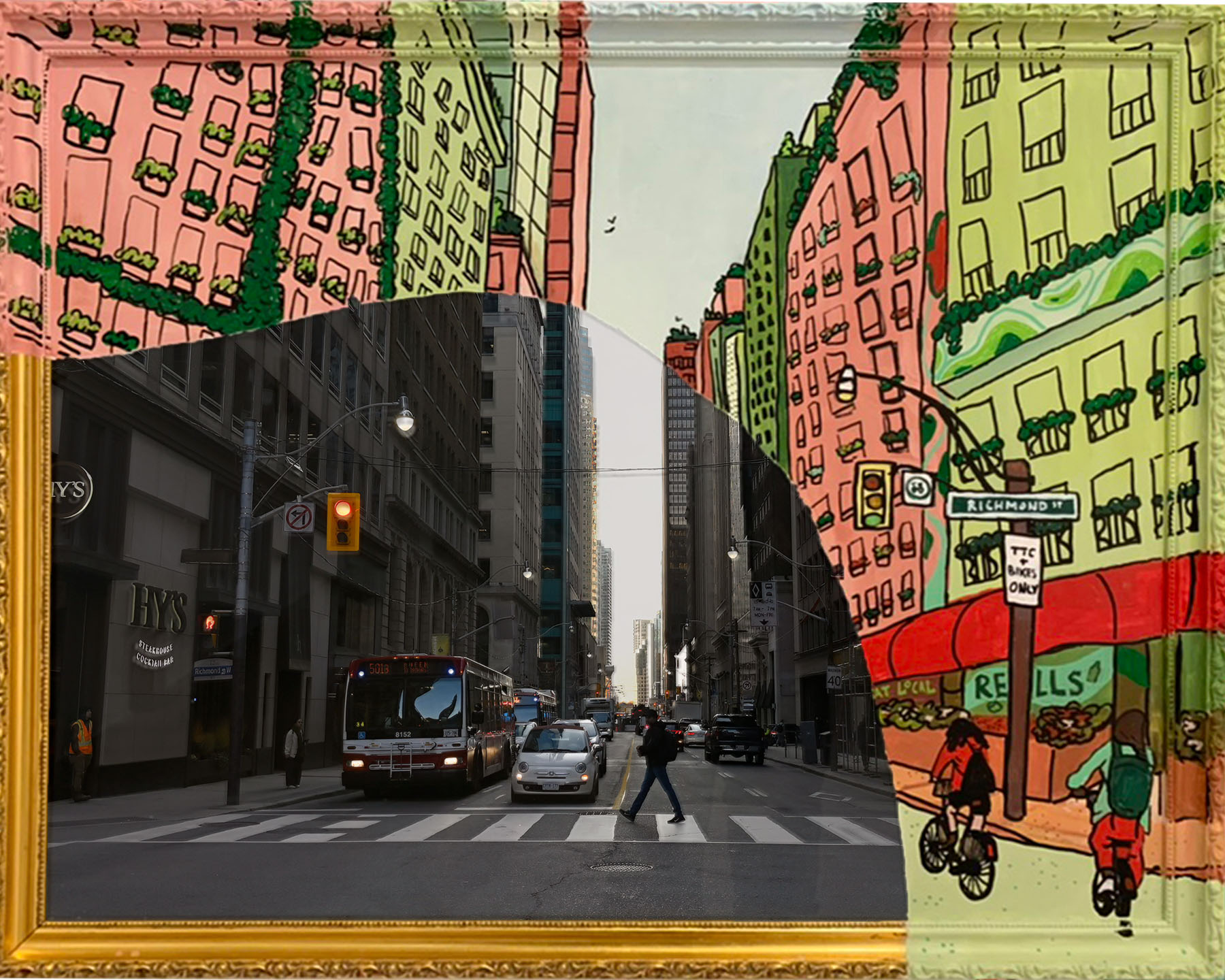 This series examines the excessive space that Canadian cities dedicate to vehicles, using my current home of Toronto as the canvas. My illustrations invite the viewer to enter an alternate reality through the lens of ecological urbanism, new urbanism, and sustainable transportation. Changing infrastructure in cities to incorporate and exploit nature is not a new idea; the concept of ecological urbanism first appeared in urban planning in the late 20th century to address issues of sustainability. Long before this architectural movement, Indigenous communities across this land cared and advocated for the natural world in our urban centers. As our world navigates through the climate crisis, our communities need to grapple with making large changes to our lifestyle.
