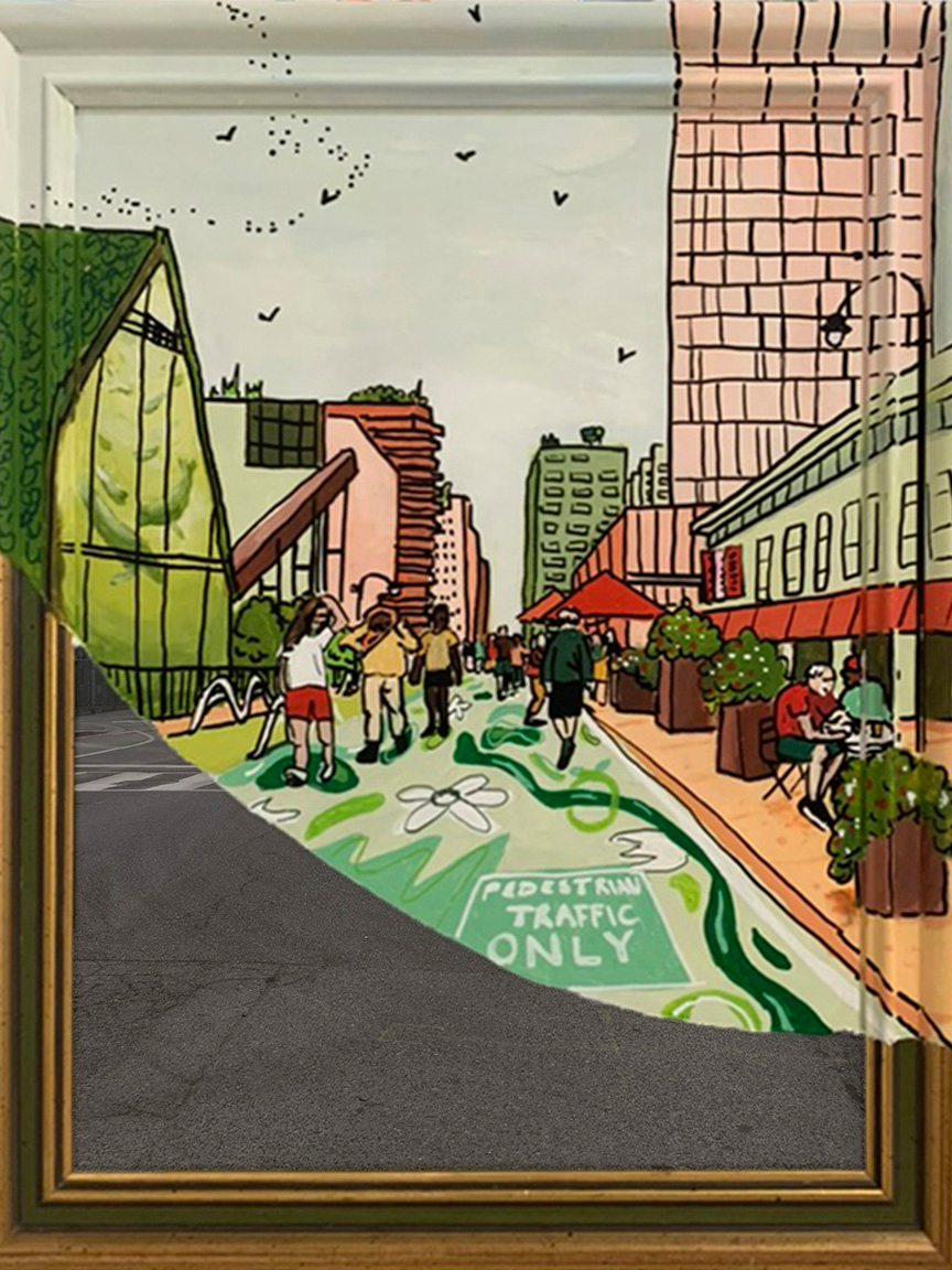 I strive to use second hand materials in my work or create work that can be reused and repurposed. As such, I used thrifted frames and painted with acrylics on top of the glass. This means the piece is not permanent and the frames can be scraped clean and reused after I am done with my work. This piece questions conventions in fine arts to mutually urge viewers to question their conventions of city streets. Why do we dedicate so much space to vehicles? When did we decide that the city should be dedicated to individuals passing through rather than the population occupying that space? How could we evolve the city to be more inclusive of people and nature?