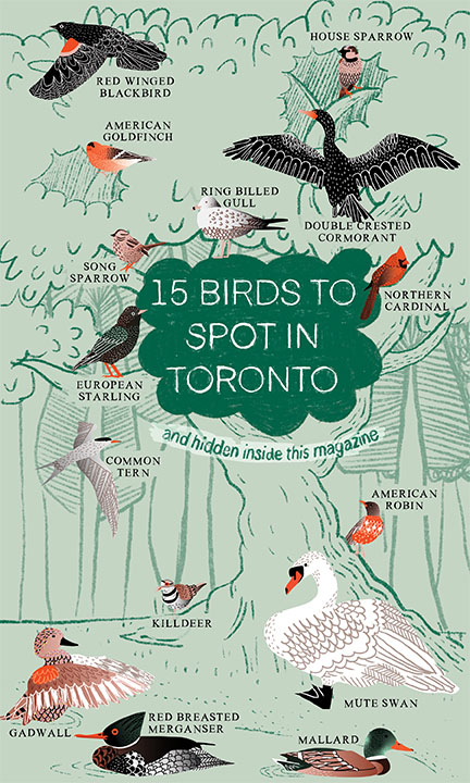 My goal when making this magazine is to make a piece of art that can also be a utility. I am targeting nature lovers and novices alike to have a portable magazine that they can pick up use as a map to lead them on an adventure or sit down with a coffee to read stories about different ways people access nature in cities. I was inspired by Posterzine – a foldable magazine where each issue becomes its own poster, and The Featherhead Review – a magazine that takes on a unique form each issue. I was also inspired by my love of nature, bird watching, and the desire I have for a space to learn about nature access points in downtown Toronto.
