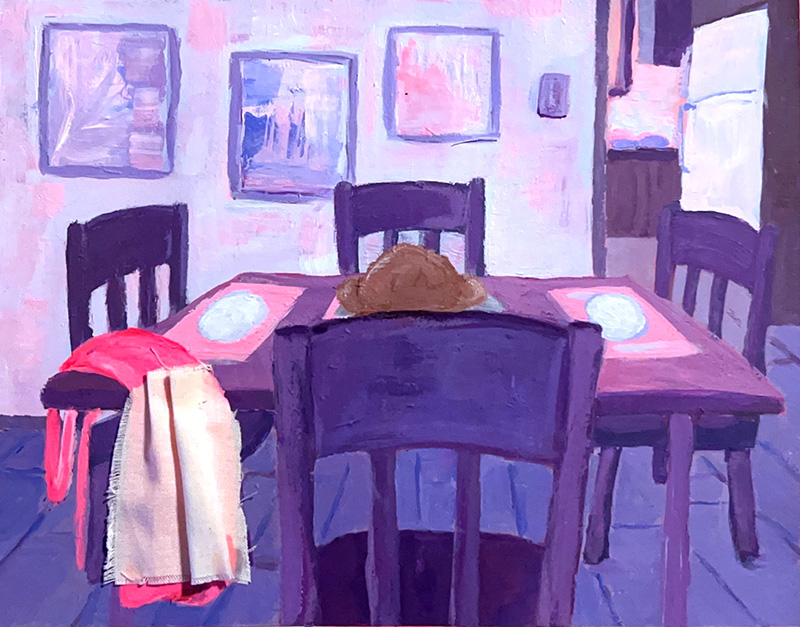 I use a fusion of traditional painting and collage to depict a modern kitchen, to combine the historical and contemporary narratives surrounding women’s roles. I draw inspiration from my own modern kitchen and combine traditional means with contemporary imagery to symbolize the enduring cycle of domestic kitchen responsibilities that still persists. In each piece, the presence of an apron serves as a metaphor for the entrapment often experienced by women with this patriarchal cycle. The apron, seemingly removed, signifies an act of defiance.