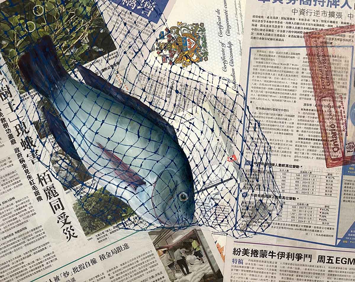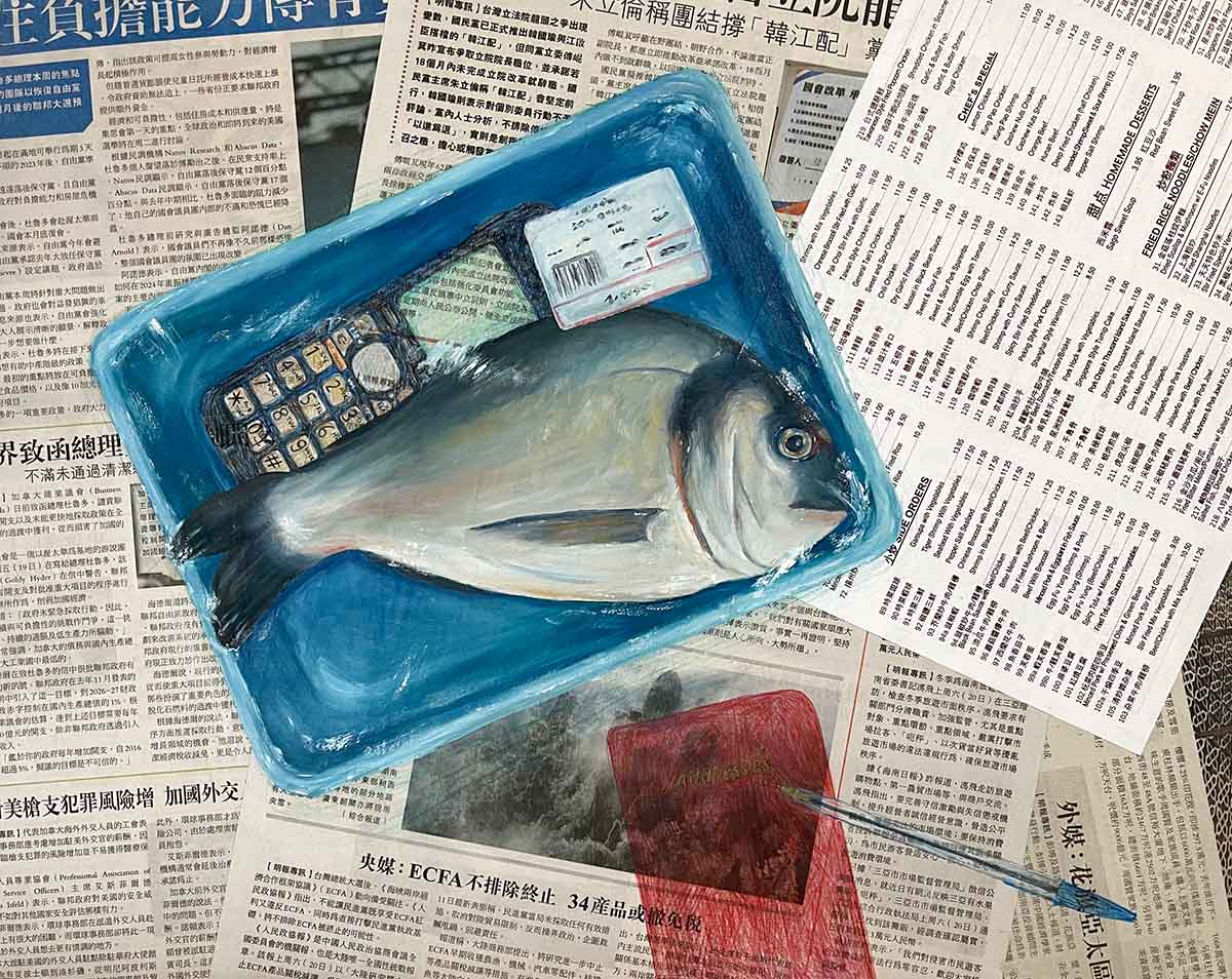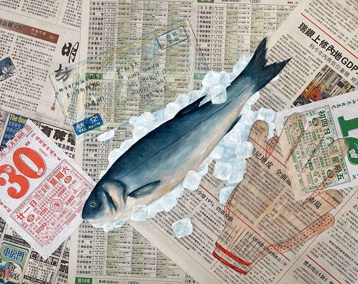 Like a Fish Out of Water combines oil paint, coloured pencil, and mixed media on wood panels. The Chinese newspaper used as the foundation of each work represents the linguistic barrier between my parents and I. Other paper media makes reference to life in Canada and ways of adjusting. Viewers are invited to complete the story by piecing together the different layers of meaning and material presented in the work.