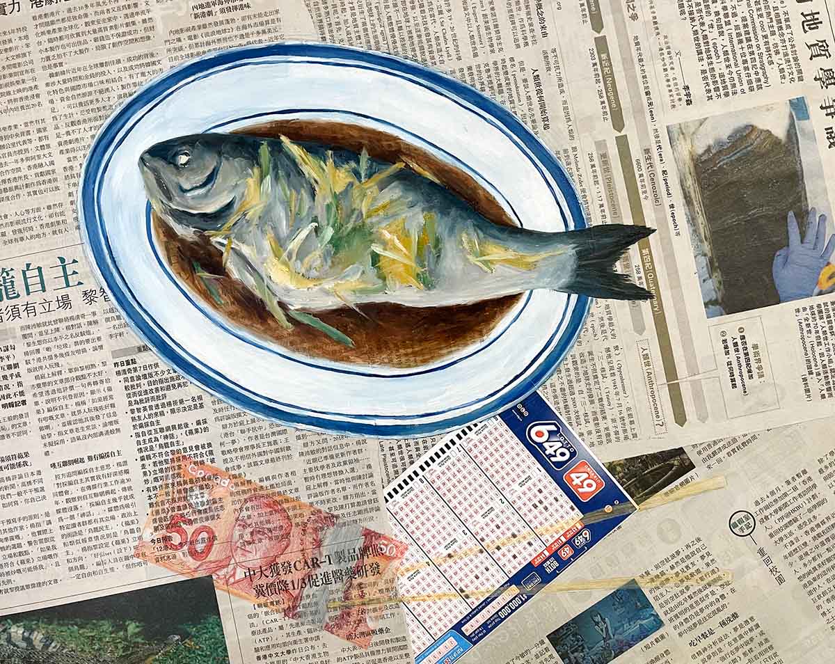 This series utilizes the visual representation of a fish in different environments to portray my parents’ experience as new immigrants in Canada. My work captures a sense of isolation and impermanence that one might feel when navigating through a new country. From my perspective, immigration is a journey of entanglement, suspension, assimilation, and sacrifice. I chose to showcase the fish through the lens of food because the recognition of fish as an ingredient is universal. To eat a whole fish in Chinese culture symbolizes abundance and prosperity, a wish that many immigrant parents have for their family.