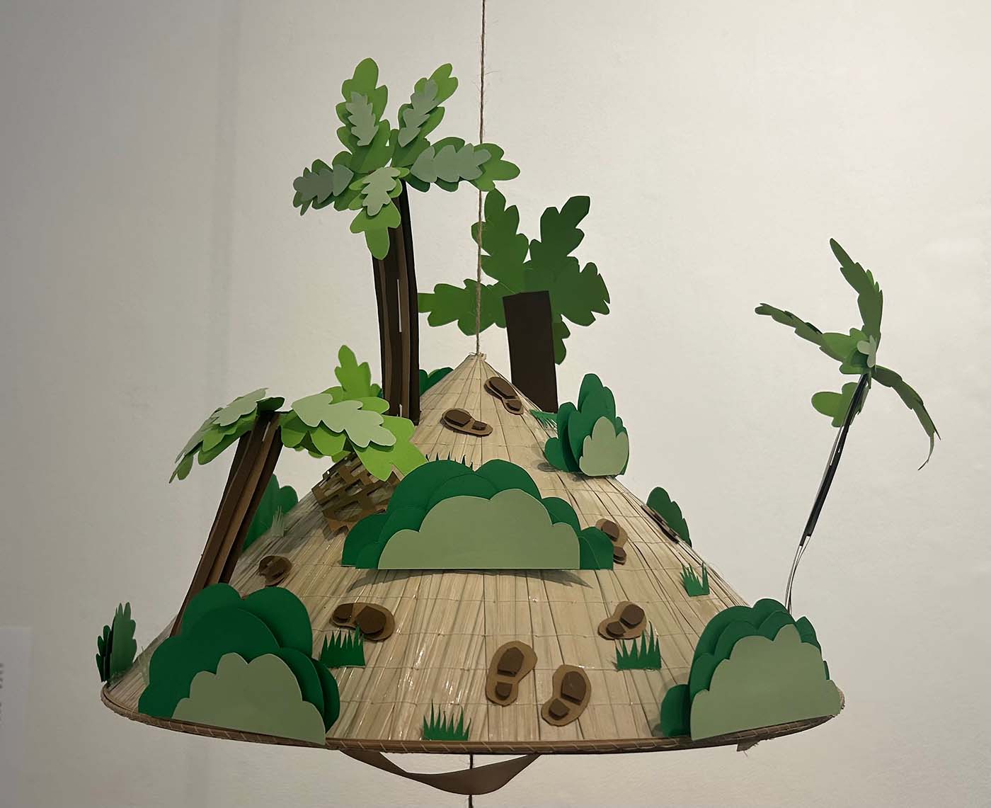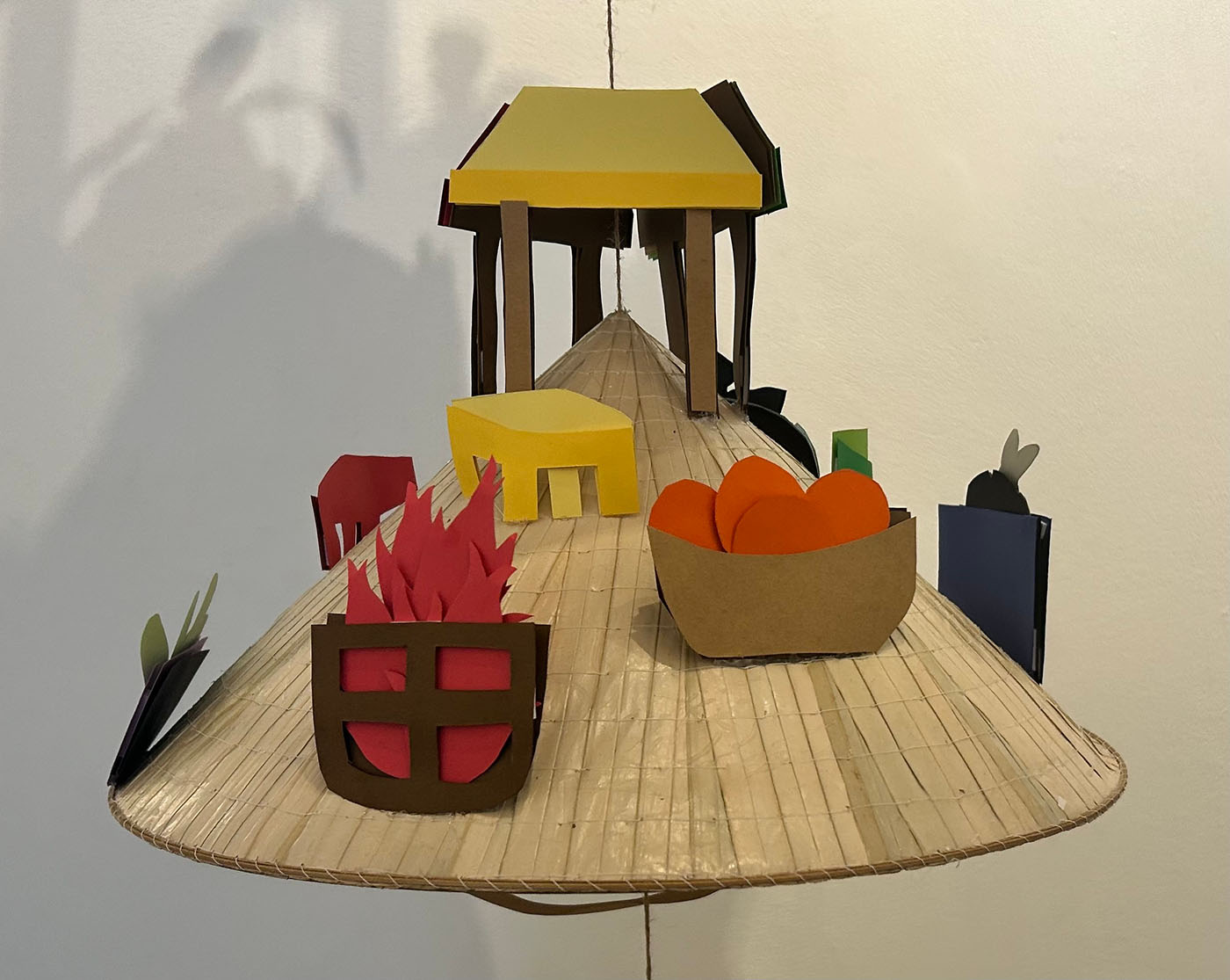 I illustrated the memories using paper cutouts to convey childhood and displayed them on the nón lá (leaf hat). A nón lá is a symbol of Vietnam and my mom’s memories of home. By sharing my mom’s story and having conversations about her past, I have learned more about my cultural identity. I would like this project to remind myself to make conversation and create moments with my mom. For us to acknowledge the hardships and to reminisce each moment that bonds us.