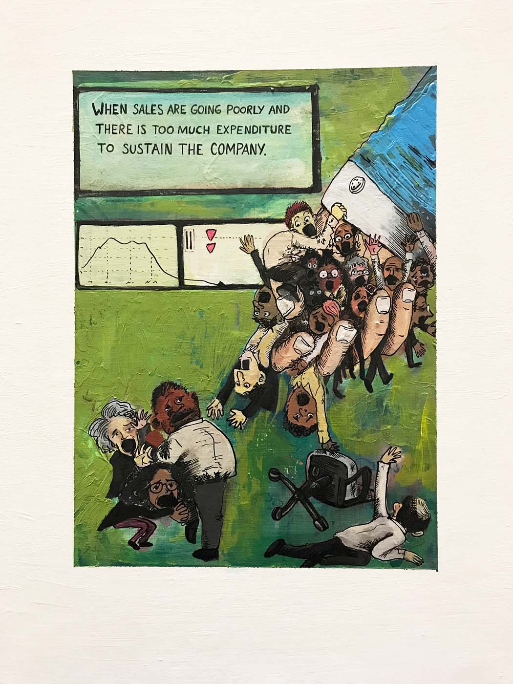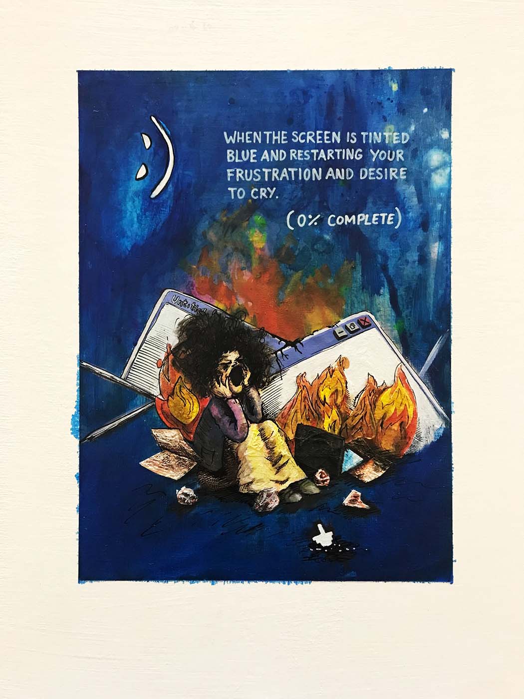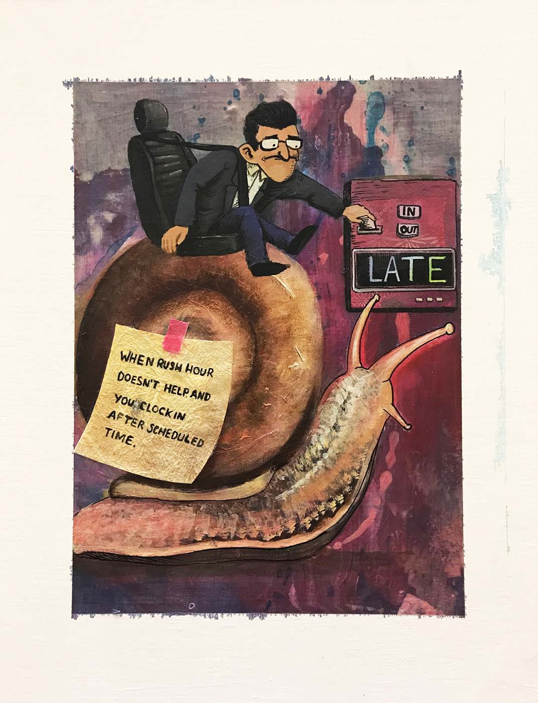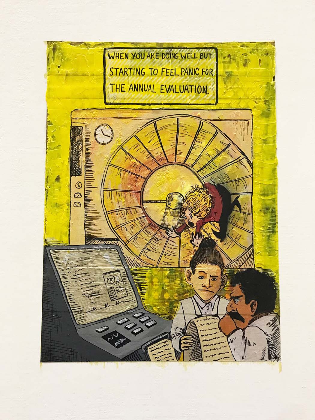 In this series of four illustrations inspired by toxic productivity in the workplace, I want to recreate funny metaphors that come to light in critical moments of stress that I have experienced throughout my life. Each one is related to burnout.
