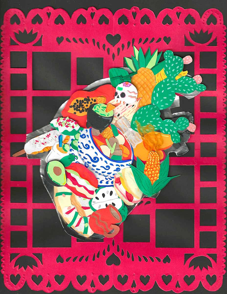 For the exhibition, I took inspiration from Mexican Papel picado (“perforated paper,” or “pecked paper”), a traditional handmade decoration present in our most important festivities such as Dia de Muertos, an important celebration where we remember those who are dead by cooking their favorites foods and decorating and create an altar to them which we decorate with said paper. To give life to these pieces I fused this traditional art with modern paper-cut art to create pieces that reflect the vibrant world I experience through food.