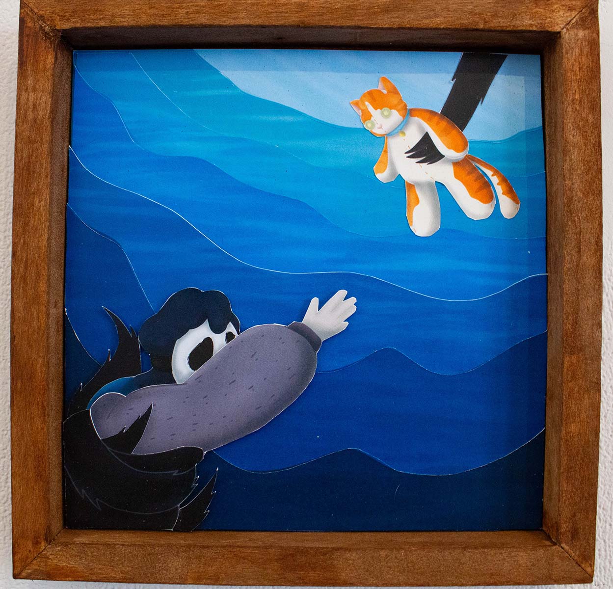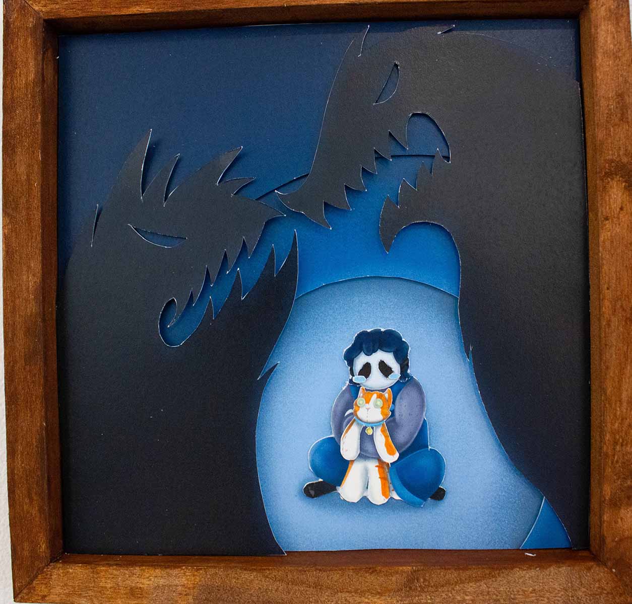 “Comfort in the Dark” is a series I made to express certain struggles from childhood. Each piece in this series depicts a faceless child coping with traumatic experiences with the help of their stuffed toy. The toy throughout my illustrations was inspired by my cat and emotional support animal, Penn, as he has become the newest support system in my life, similar to my toys when I was young. Raising children has never been an easy task, but my work is meant to highlight just how much the way parents act stick with their children while they grow.